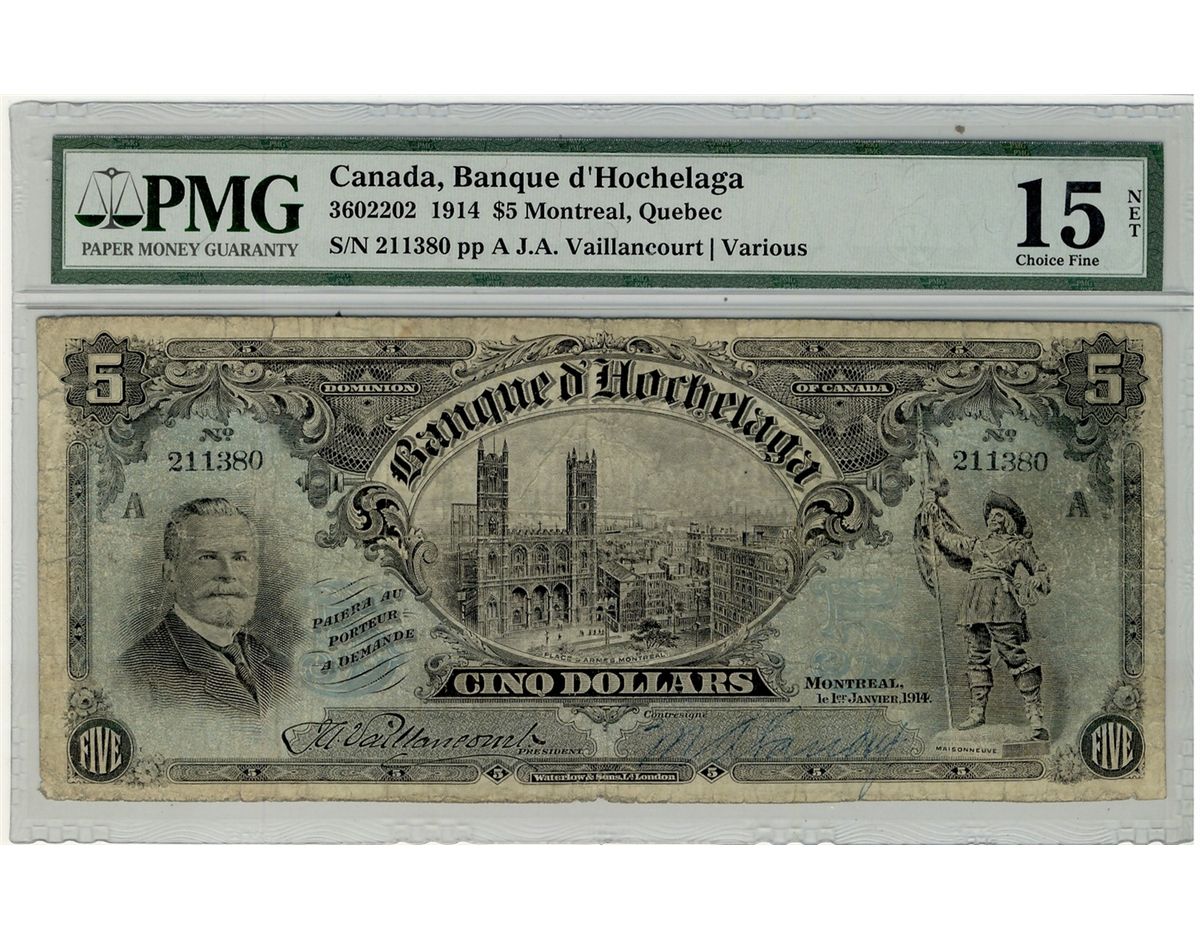 Banque d'Hochelaga; 1914 $5 #211380 CH-360-22-02 PMG CH F15 Net. Tears. More popular bank issue.