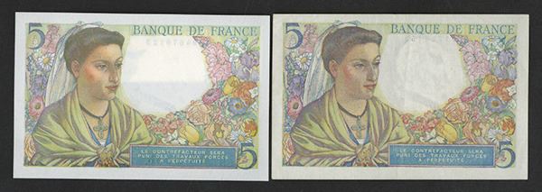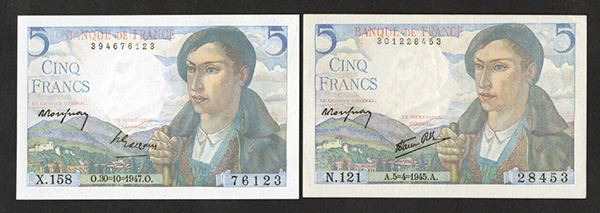 France 5 Francs P-98a m/c 5.4.1945, 5 Francs P-98b m/c 30.10.1947 issued bank notes. Pyrenian shepherd at right, woman with flowers at left. A delightful pair. 1 CU and the second XF.