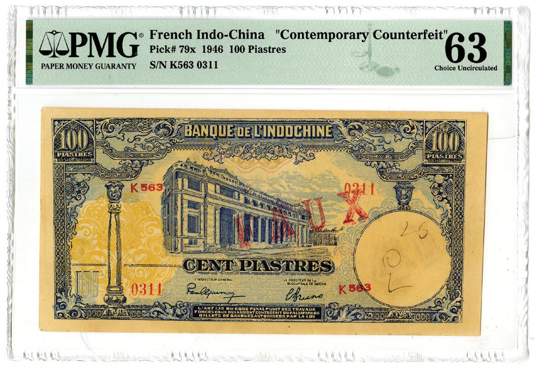 French Indo-China. 1946. 100 Piastres, P-79x, Contemporary Counterfeit note, Blue on multicolor underprint on brown paper, S/N K563 0311M, PMG graded Choice Uncirculated 63 with comments "Cancelled" and "Annotations". Possibly one of the highest graded examples known.