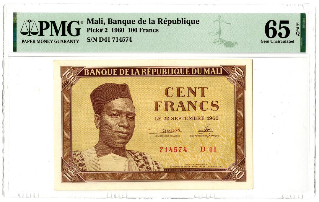Mali. 1960. 100 Francs, P-2, Issued banknote, Brown and yellow on face, S/N D41 714574, PMG graded Gem Uncirculated 65 EPQ.