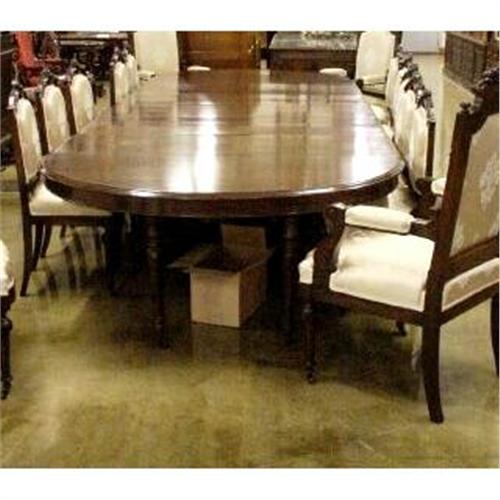 This is a fantastic Victorian Banquet table consisting of a table that is a 63" by 55" oval when closed, six 17.25 inch by 63" long skirted leaves, four arm chairs and ten side chairs. The table is 158.5 inches long with the leaves in place. It would expand to hold at least two additional leaves. The set has been totally restored and the chairs re-upholstered. The carving on the base of the table and on the chair crests is great. There are fold down support legs at each end of the table. The arm chairs are 49" tall by 26" wide. The side chairs are suitably smaller as can be seen in the photo of the chairs. A great and rare suite. I have more detailed photos available by email.