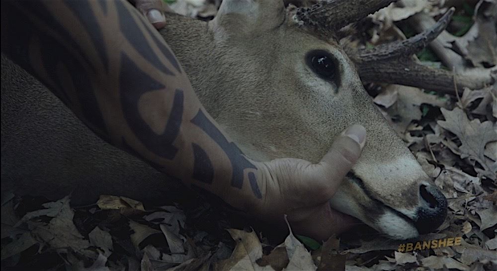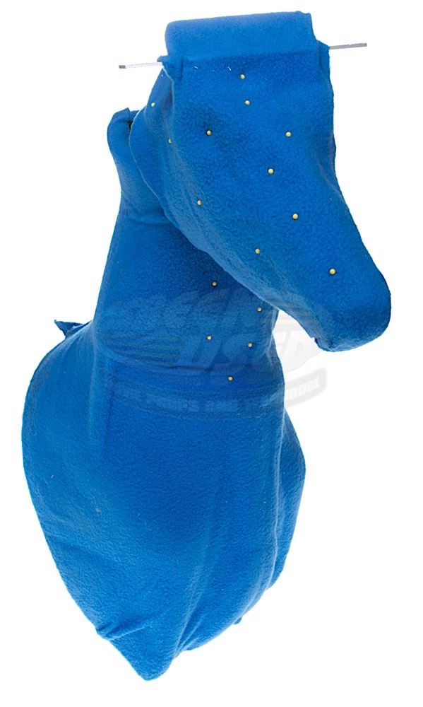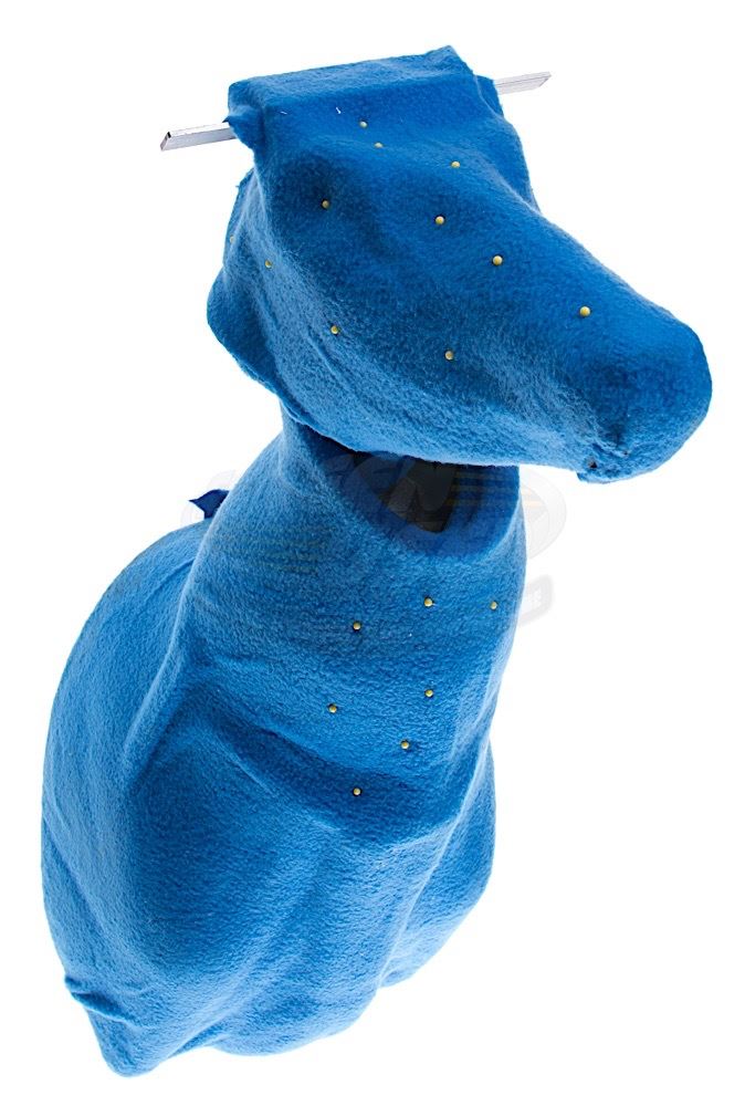 This FX deer head was custom-made by the production for use during filming of the deer neck breaking scene with Chavton Littlestone (Geno Segers). The head and neck are wrapped in blue fabric with small yellow stick pins applied to various locations. The head turns from side to side and minor wear from use is present. Measures 30" x 22" x 11".