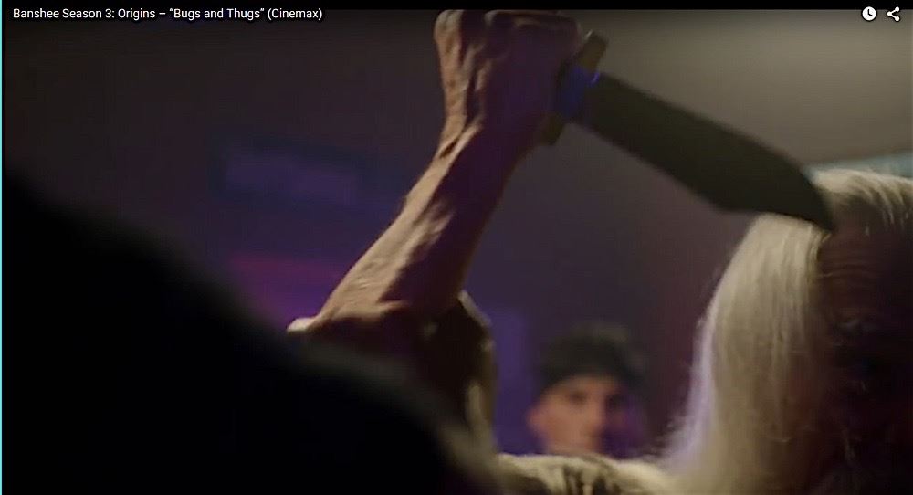 This prop knife was custom-made by the production for use by various actors in the season 3 "Banshee Origins". The knife is made of rubber for use during stunts and is detailed to look like its metal counterpart. Measures 14" in length, with minor wear from use.