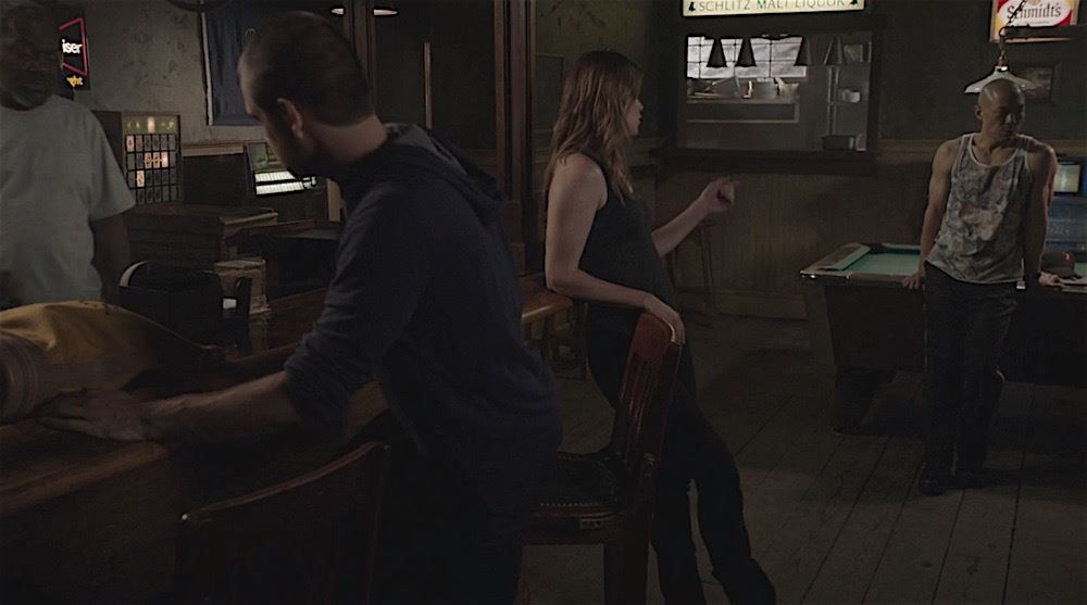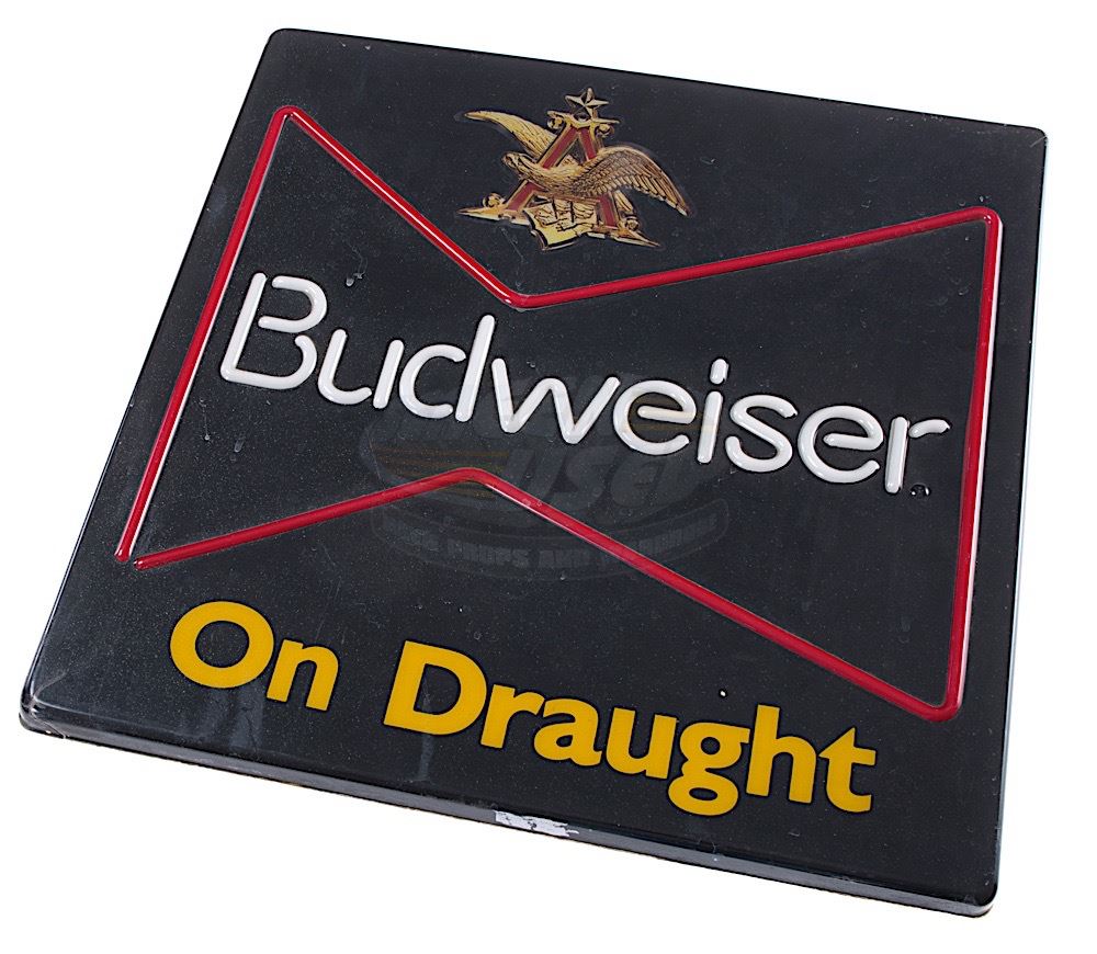 This wall mount Budweiser lighted beer sign was acquired by the production for use as set dressing in the "Forge" bar. The sign is made of plastic and features the Budweiser logo. Measures 18" x 18" x 4.5", with an internal set of lights that are powered by a standard 110 volt outlet plug. Minor wear from use and studio weathering is present, one internal light is loose.