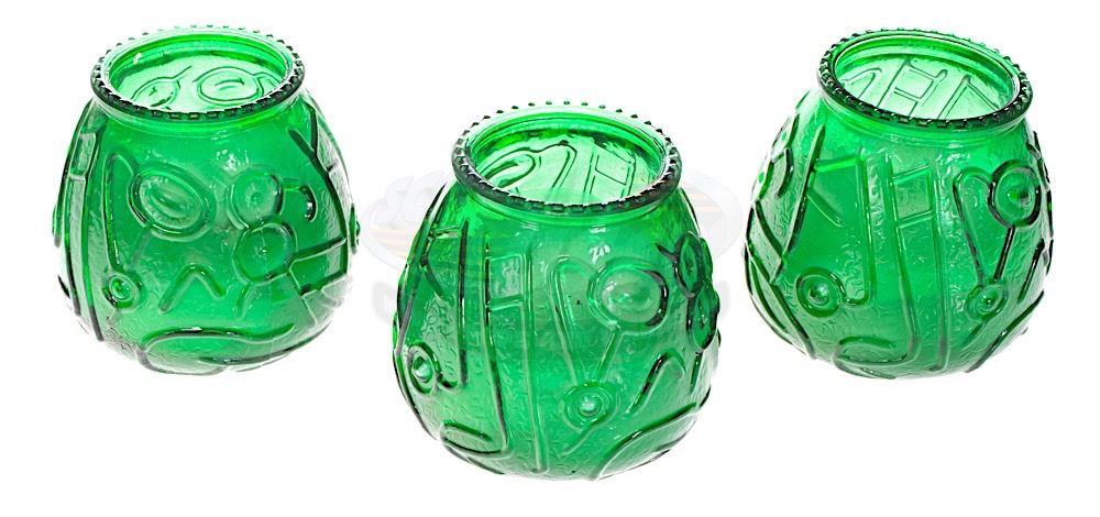 This set of three table candles were acquired by the production for use as set dressing in the "Forge" bar during filming of various episodes. The candles consist of green tinted glass with white candle wax. Each measures 3.75 " tall x 3.75" in diameter.