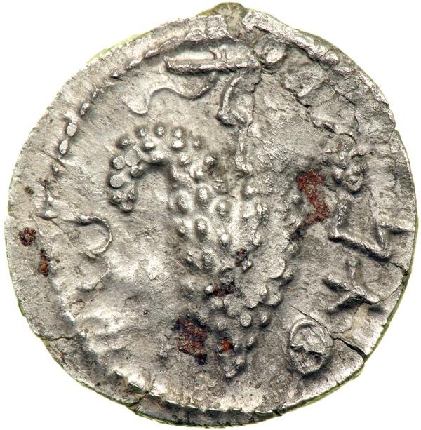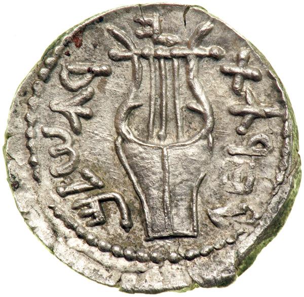 Bar Kokhba War, 132-135 CE. AR Denar (3.27 g) attributed to year 3 (134/5 CE). Triform bunch of grapes. Reverse: Kithara with three strings. AJC 57b; Mild 186 [101 examples cited]; H-734. Porous, especially so on the obverse. About Extremely Fine.