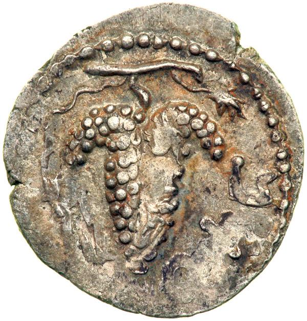 Bar Kokhba War, 132-135 CE. AR Denar (3.45 g) attributed to year 3 (134/5 CE). Triform bunch of grapes. Reverse: Kithara with three strings. AJC 57b; Mild 159 [38 examples cited]; H-734. Very Fine.