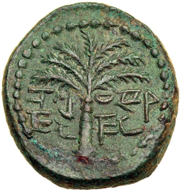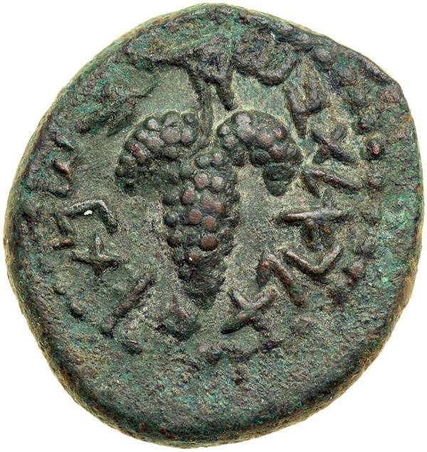 Bar Kokhba War, 132-135 CE. Small Bronze dated year One (132/3 CE). Triform bunch of grapes. Reverse: Palm tree with seven branches. Mild 147; AJC 8. H-681. Lovely green patina; Superb Extremely Fine .