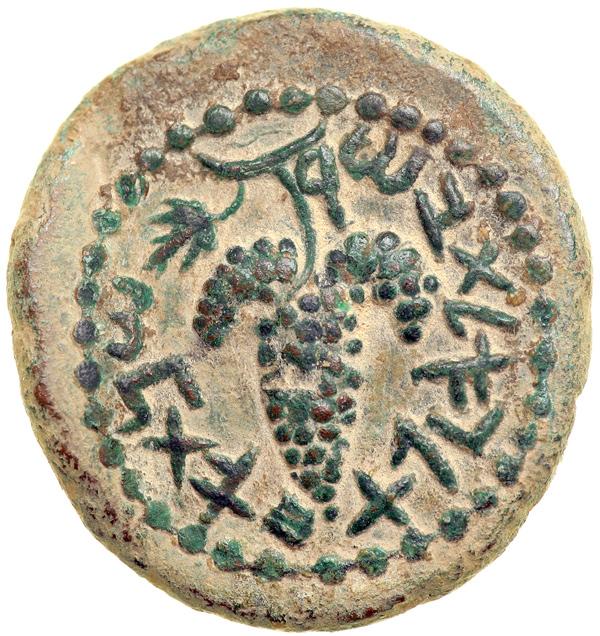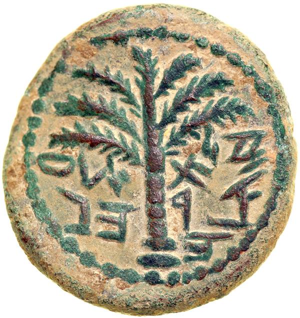 Bar Kokhba War, 132-135 CE. Small Bronze dated year One (132/3 CE). Triform bunch of grapes. Reverse: Palm tree with seven branches. Mild 14;. AJC 7a; H-681c. Earthen patina, uneven flan. Extremely Fine and perfectly centered.