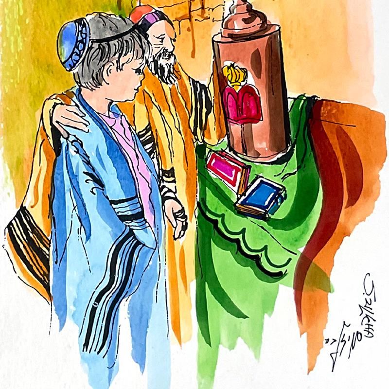 Bar Mitzvah by Zilkha Original. "Bar Mitzvah" is a one-of-a-kind hand watercolored mixed media on paper by Sami Zilkha, hand signed by the artist. Includes Letter of Authenticity. Measures approx. 9" x 12" (border), 7" x 9" (image).