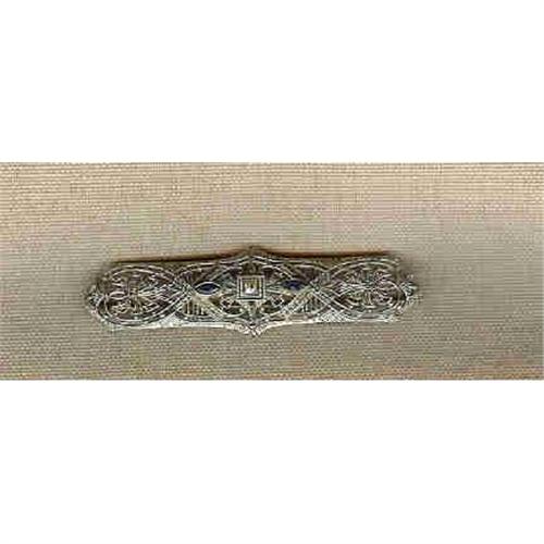 2.1/8" long 3/8" wide.Small diamond in center with a marquis sapphire on each side.. Intricate work. Very Deco. 10k. White Gold.