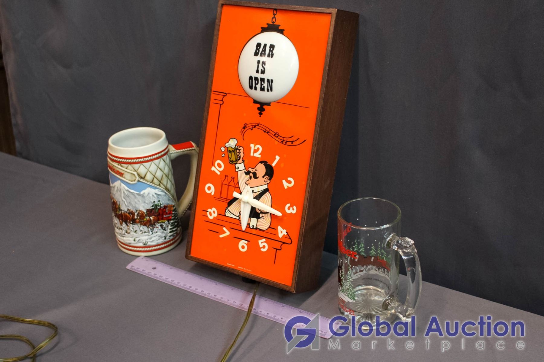 Bar is Open' Light Up Clock (Working) W/ 2 Budweiser Mugs