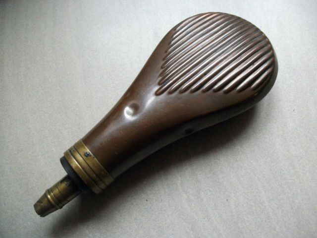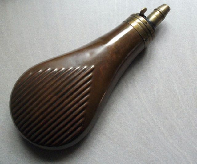Bar pattern Sykes Powder Flask, copper body and adjustable brass top, stamped -Sykes-.Two minor dings Overall length8 inches.
