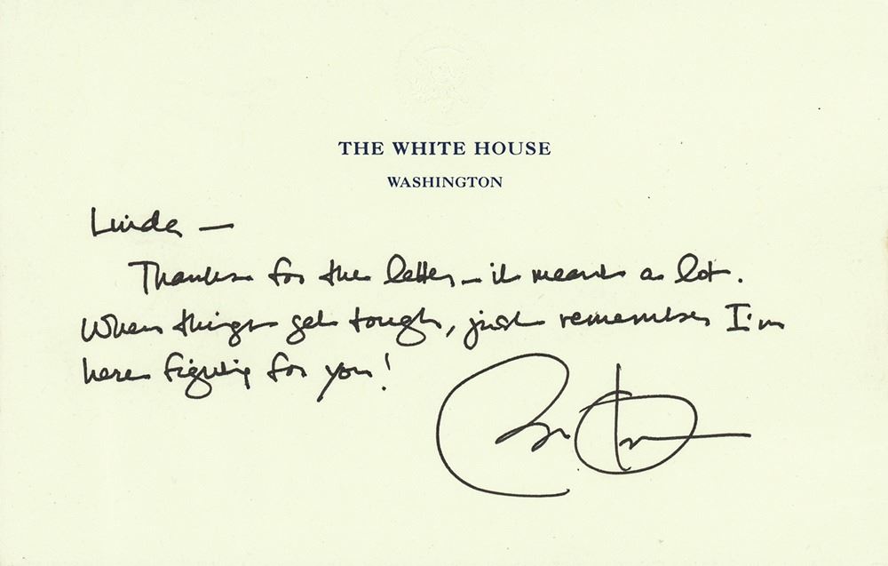 Extremely rare ALS as president, one page, 6.5 x 4, embossed White House stationery, no date. Handwritten response to a woman entreating for greater awareness and federal assistance within the mental health sector, in full: "Thanks for the letter--it means a lot. When things get tough, just remember I'm here fighting for you!" In very fine condition. Accompanied by the original White House mailing envelope.