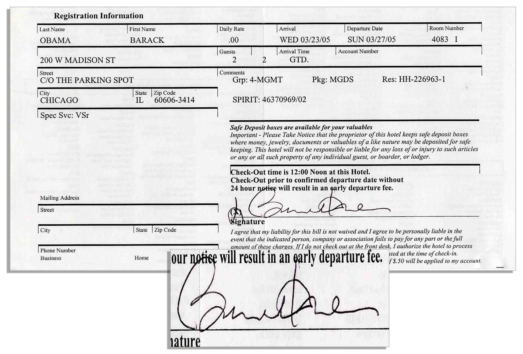 Pristine hotel registration card signed by Barack Obama as a Senator, dated 23 March 2005, for two guests at a rate of $400 per night, with a 27 March 2005 checkout date. Registration information includes his ''200 W. Madison St. c/o the Parking Spot, Chicago, IL'' address printed. With an excellent, clear ''Barack Obama'' signature in black ink. Card measures 8.5'' x 4.5'' and is in fine condition.