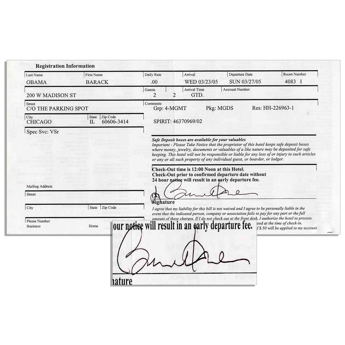Pristine hotel registration card signed by Barack Obama as a Senator, dated 23 March 2005, for two guests at a rate of $400 per night, with a 27 March 2005 checkout date. Registration information includes his ''200 W. Madison St. c/o the Parking Spot, Chicago, IL'' address printed. With an excellent, clear ''Barack Obama'' signature in black ink. Card measures 8.5'' x 4.5'' and is in fine condition.