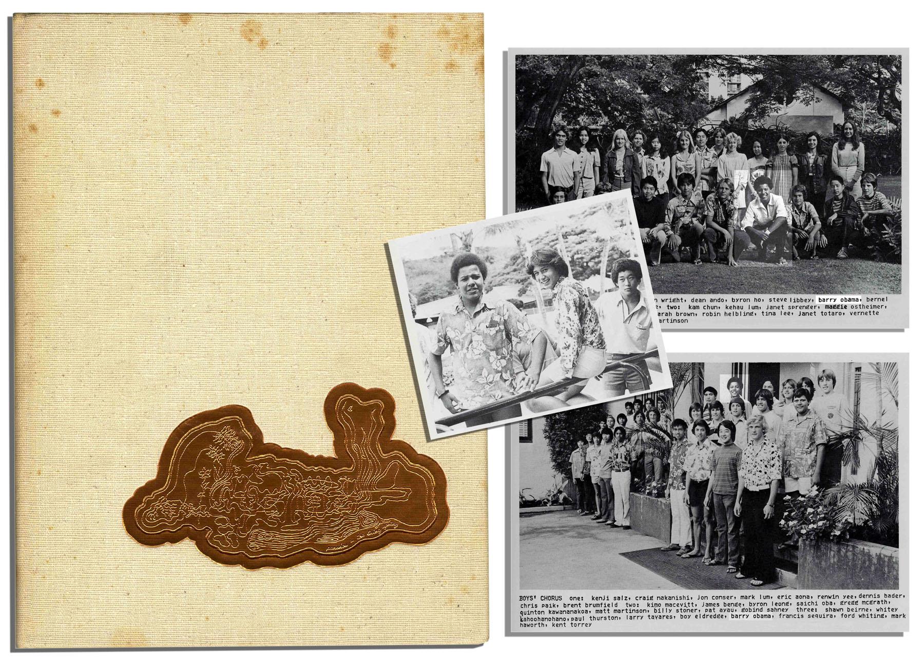 President Barack Obama's 9th grade ''Na Opio O Punahou'' (Punahou School, Honolulu, Hawaii) 1976 high-school yearbook, with three photos of a young Obama depicted. In the first, Obama squats in the front row smiling with classmates; in the second, he poses candidly wearing a Hawaiian shirt; in the third, he stands with the boys' chorus. In each photo he is listed as ''Barry Obama.'' Yearbook measures 9'' x 12'' with minor foxing to cover and expected signatures from classmates throughout. Near fine condition.