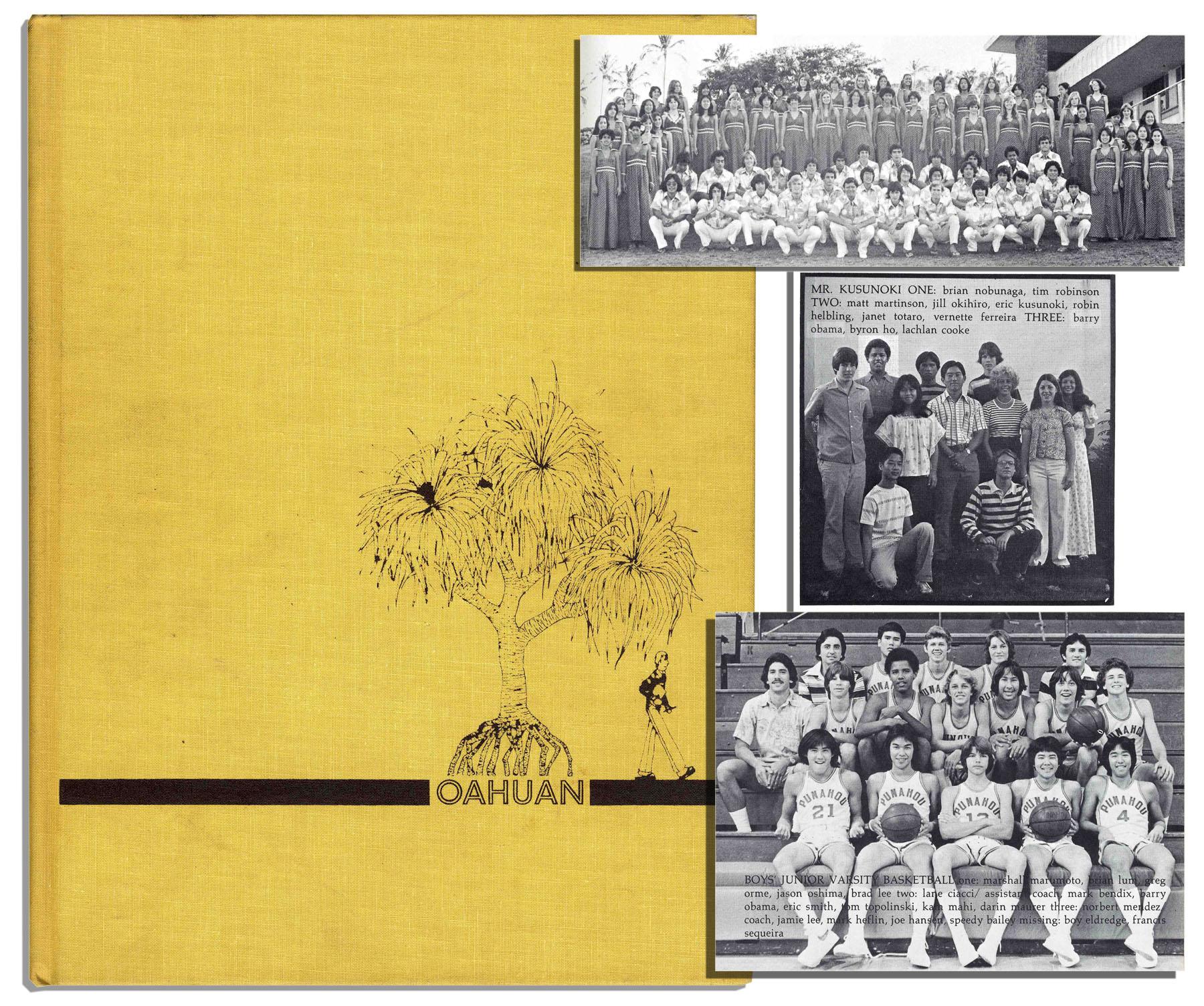 President Barack Obama's 10th grade ''Na Opio O Punahou'' (Punahou School, Honolulu, Hawaii) 1977 high-school yearbook, with three photos of a young Obama depicted. In the first, Obama poses with the coed concert choir; in the second, he stands smiling with his classmates; in the third, he poses with teammates in his junior varsity basketball jersey. In each photo he is listed as ''Barry Obama.'' Yearbook measures 9'' x 12'' with expected signatures from classmates throughout. Near fine condition.