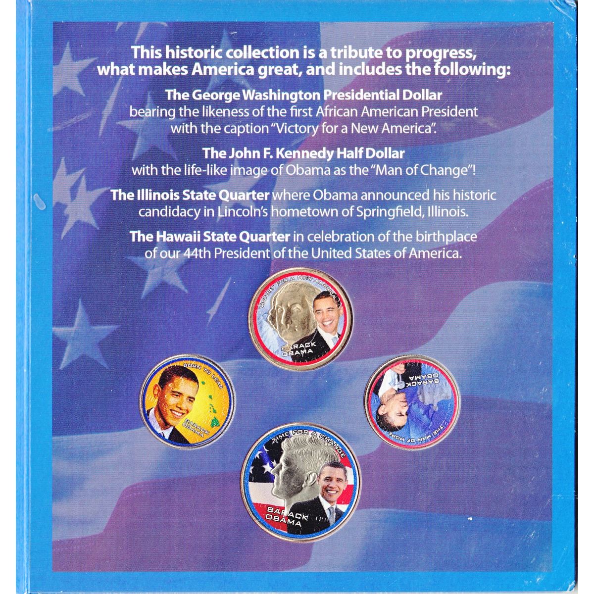 Barack Obama Presidential Colourized 4-coin Collection in Informative Folder. Buyers Premium will be added on all items as per our terms of sale. We accept Paypal, Credit Card, E-Transfer Payments, Cheque or Money Orders (there is an additional 3% fee for using Paypal or Credit Card). All invoices will be emailed immediately following the auction, please contact us if you would like to pay by credit card or receive a new revised lower total for mailing in payment or sending an e-transfer (3% discount). All Items Are Sold "AS IS", no returns
