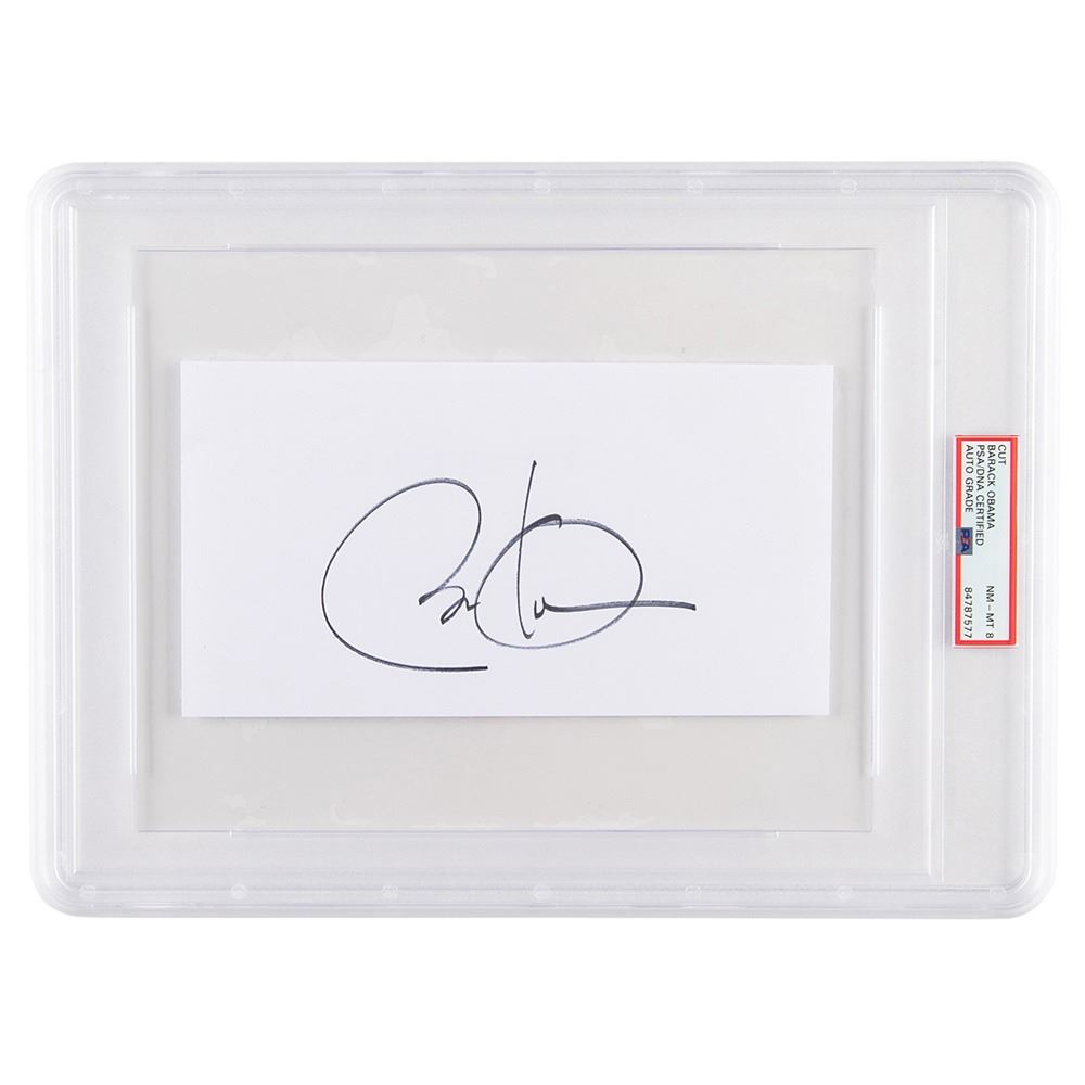 Large and bold felt tip signature, "Barack Obama,& rdquo; on a white 8.25 x 4.5 slip. In very fine condition. Encapsulated and graded by PSA/DNA as "NM-MT 8."