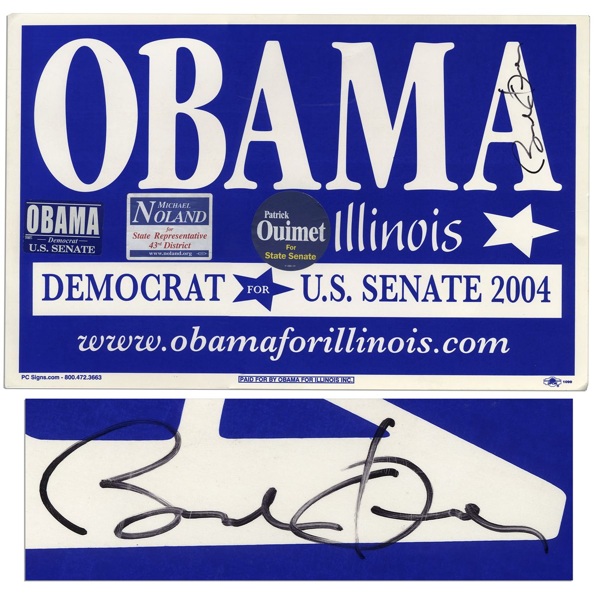 Barack Obama yard sign signed by Obama as a Senator from Illinois. Blue sign advertises, ''OBAMA / Illinois / Democrat for U.S. Senate 2004...'' Signature appears along the right edge of the ''A'' in ''Obama''. Three political campaign stickers are affixed to sign at left near center. Measures 22'' x 14''. Near fine.