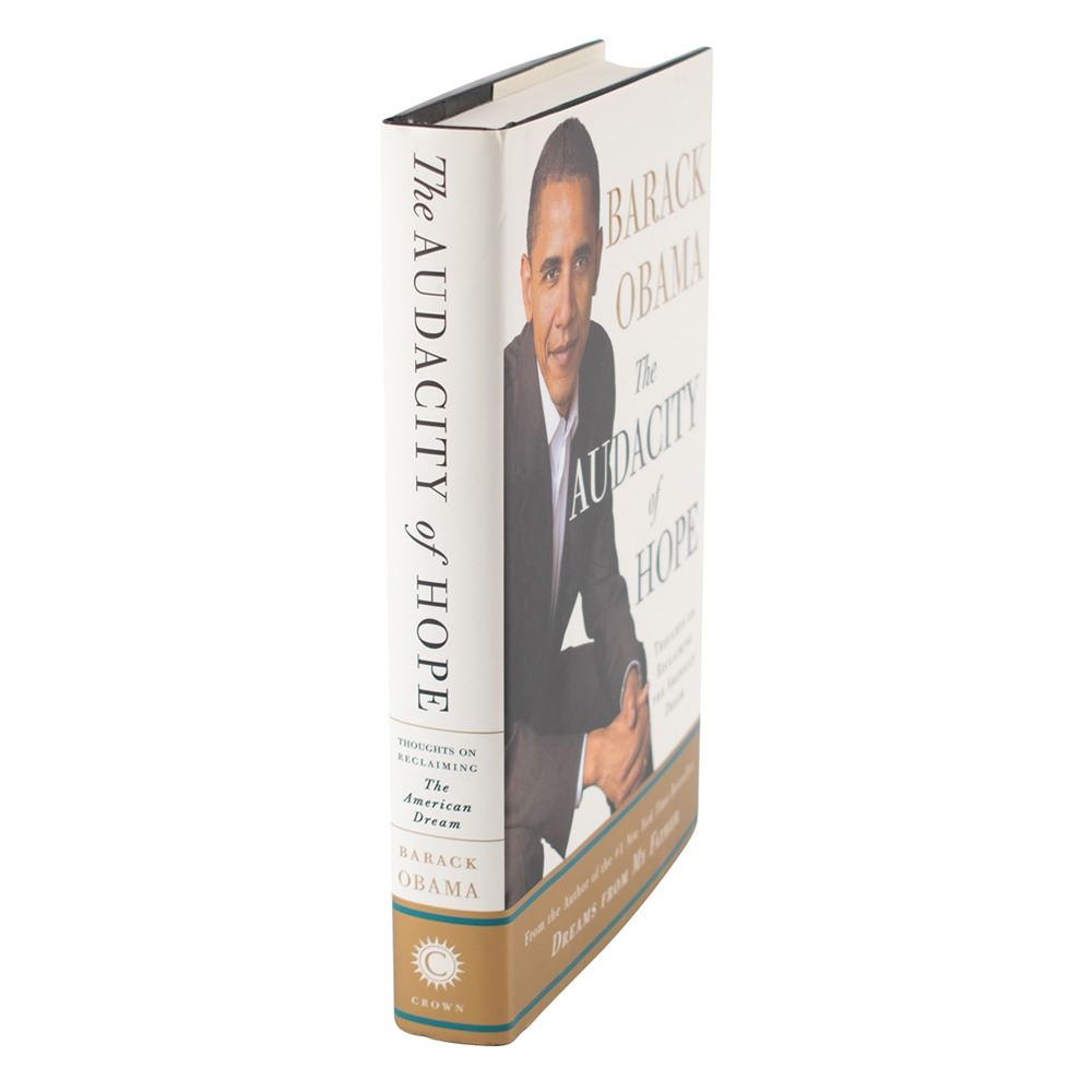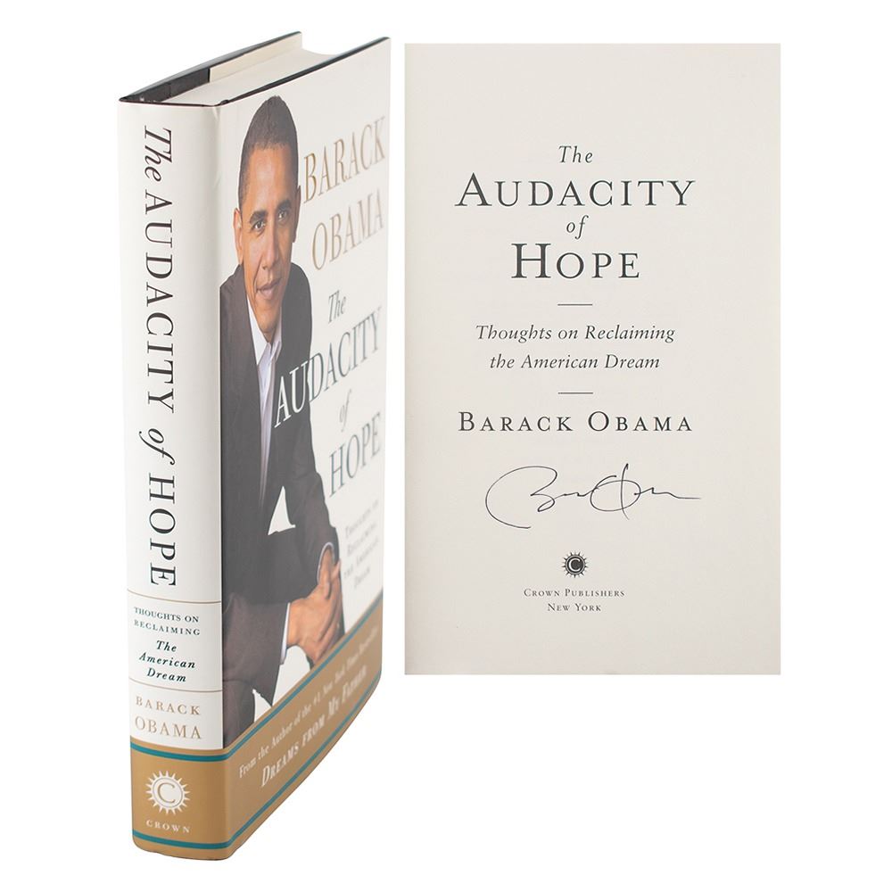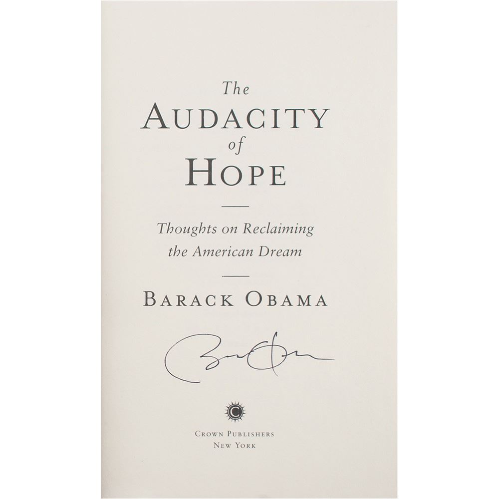 Signed book: The Audacity of Hope. First edition. NY: Crown Publishers, 2006. Hardcover with dust jacket, 6.5 x 9.5, 375 pages. Signed on the title page in black felt tip. In very fine condition, with trivial wear to dust jacket. Accompanied by a newspaper clipping indicating that the book was signed at Borders in Chicago on October 17, 2006.