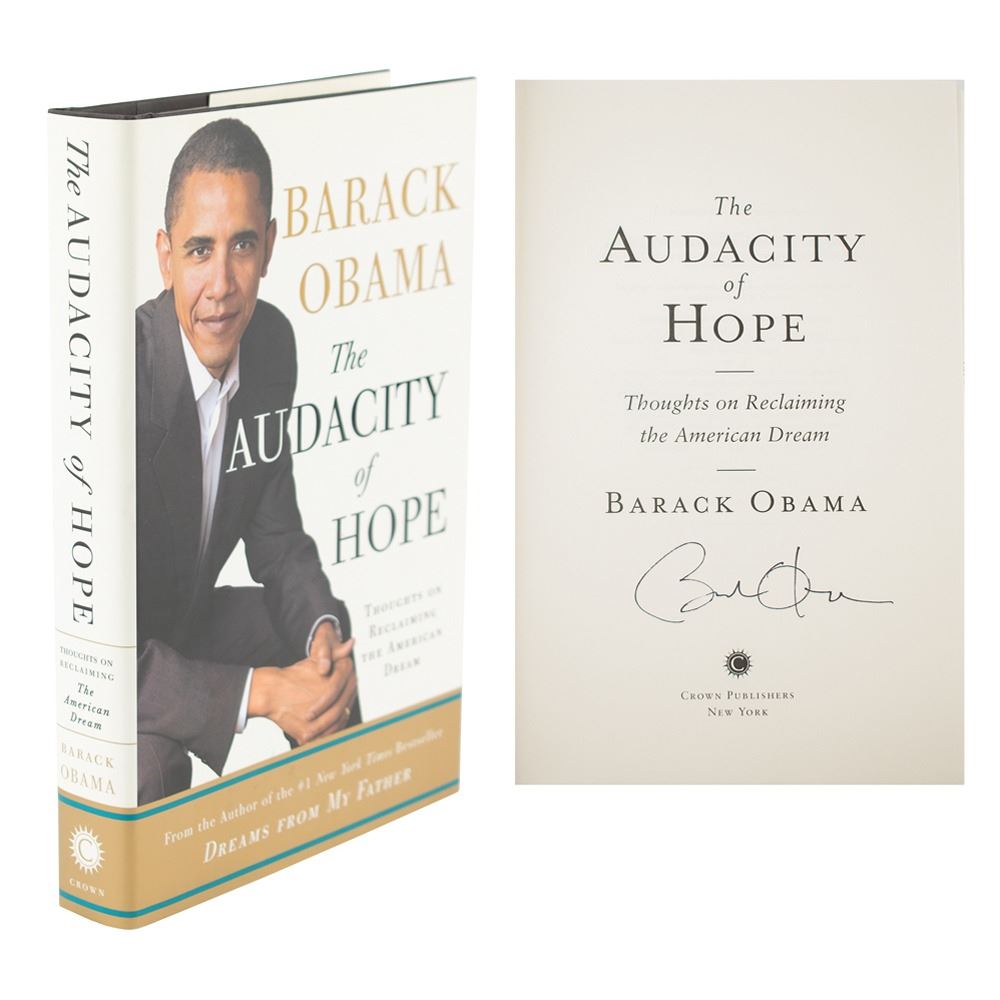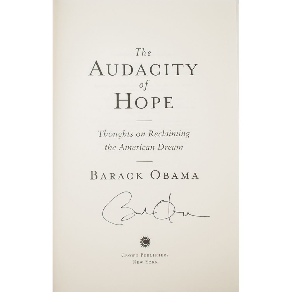 Signed book: The Audacity of Hope. First edition, first printing. NY: Crown Publishers, 2006. Hardcover with dust jacket, 6.5 x 9.5, 375 pages. Signed on the title page in black felt tip by Barack Obama. In very fine condition.