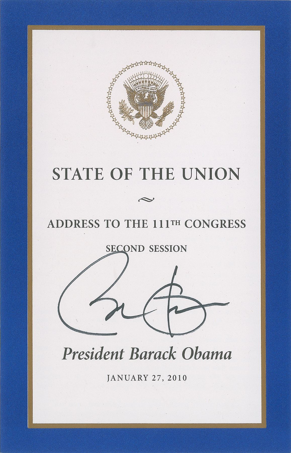 Sought-after booklet for President Obama's first State of the Union address on January 27, 2010, which focused on the theme of 'Rescue, Rebuild, Restore—a New Foundation for Prosperity,' 5.5 x 8.5, sixteen pages, nicely signed on the front cover in black felt tip by Obama. In very fine condition.
