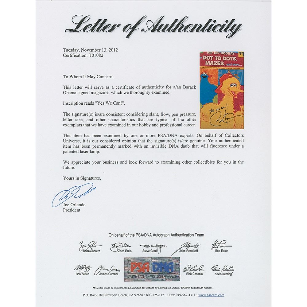 Sesame Street children's coloring and puzzle booklet entitled 'Hip Hip Hooray for Dot to Dots, Mazes, and More,' 32 pages, 8 x 10.25, signed on the front cover in black felt tip, "Yes we can! Barack Obama." In fine condition, with a few mild creases to the cover, some irregular ink adhesion to signature, and a PSA/DNA label affixed to the lower corner. Accompanied by a full letter of authenticity from PSA/DNA. Signed at a campaign event in Ohio on October 17, 2012, and accompanied by color copies of the event ticket and an image of Obama giving an address. This unusual format relates to the famous campaign controversy that began earlier in October when President Obama's Republican challenger Mitt Romney said he would defund PBS, home to the classic TV show. This evolved into the catchy 'killing Big Bird' trope used to criticize Romney throughout the rest of the campaign.