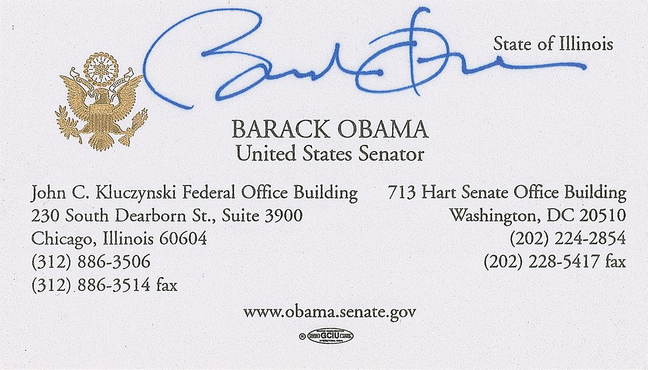 United States Senator card belonging to Barack Obama, 3.5 x 2, signed neatly in blue ink. In very fine condition.