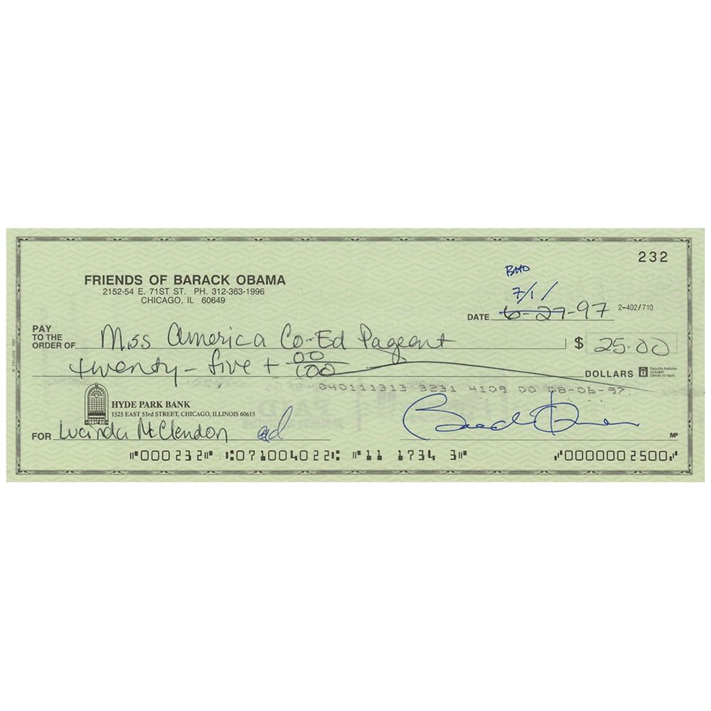 Rare, early Friends of Barack Obama check, 8.25 x 3, filled out in another hand and signed by Obama, "Barack Obama," payable to Miss America Co-Ed Pageant for $25, July, 1997. Obama changes the date from June 27th to July 1st, initialing the change, "B.H.O." In very fine condition. Friends of Barack Obama was his official campaign committee; at the time he signed this check, he had just taken his seat as a member of the Illinois state senate. Extremely rare in this format, this is the first Barack Obama check we have offered.