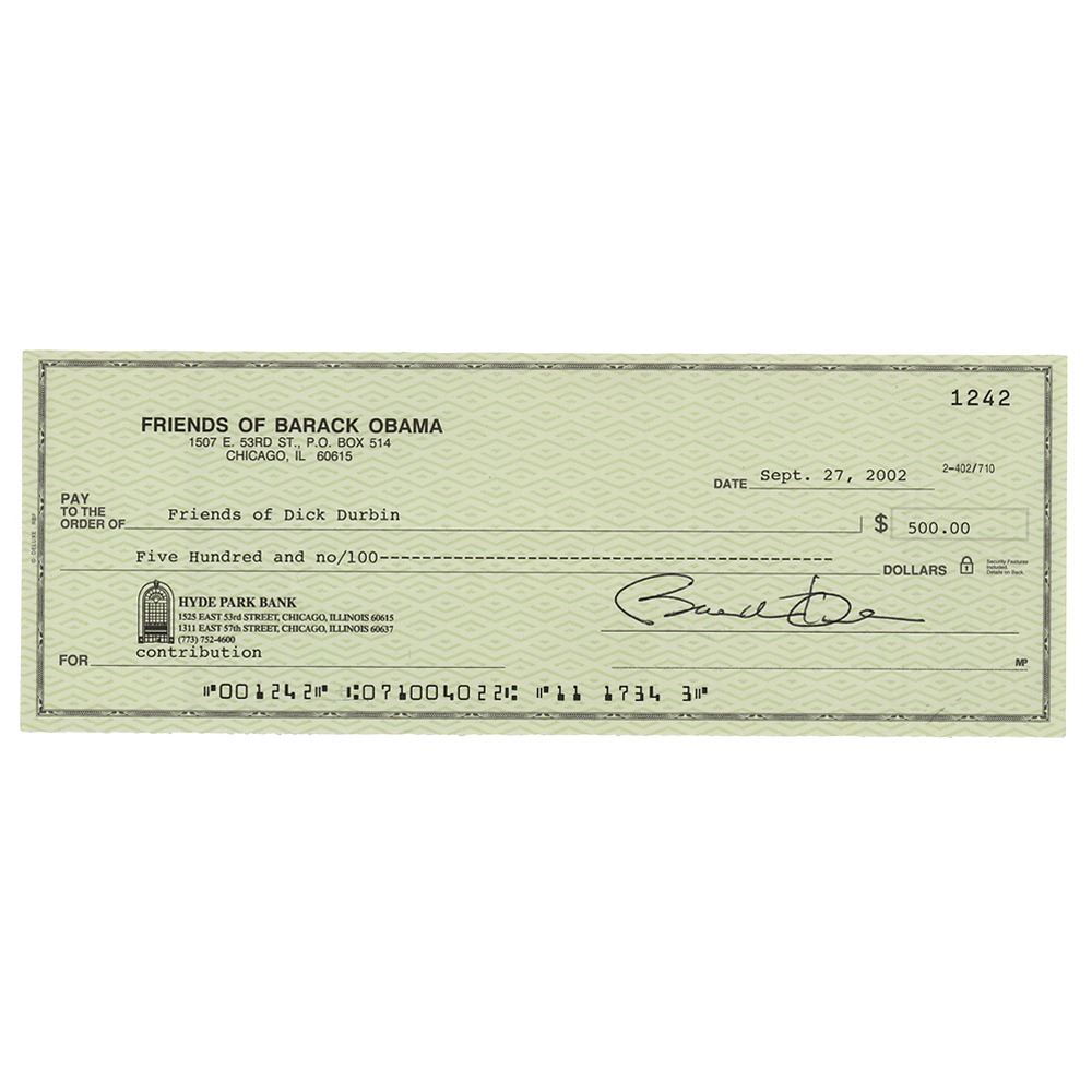 Friends of Barack Obama check, 8.25 x 3, filled out in type and signed by Obama, payable to Friends of Dick Durbin for $500, September 27, 2002. In very fine condition.