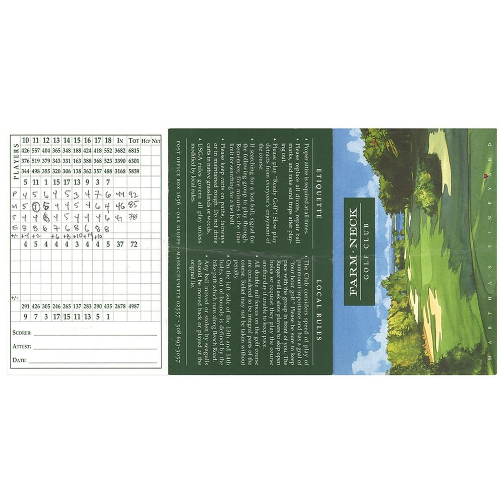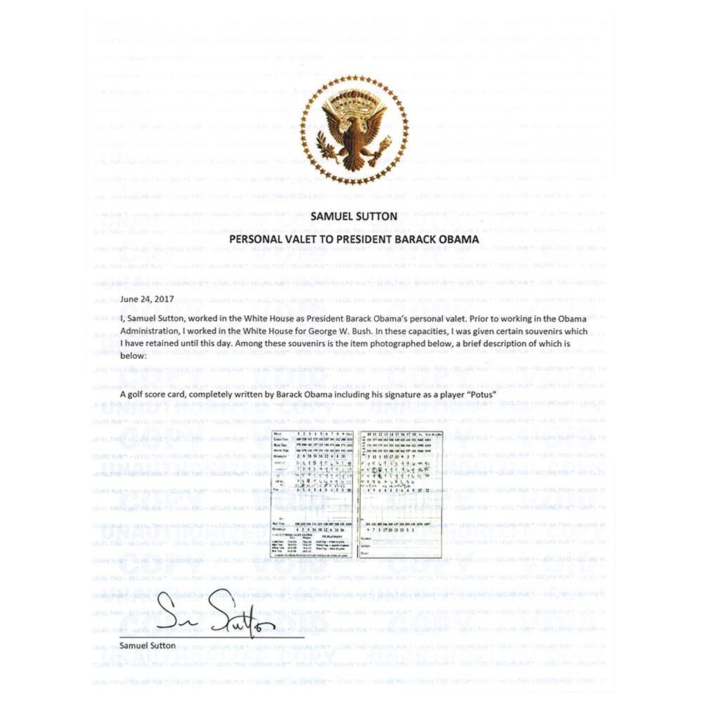 President Barack Obama’s tri-fold score card from the Farm Neck Golf Course on Martha's Vineyard, measuring 4 x 6 (folded), no date, filled out entirely by the president, who signs his title as president in the player field, “POTUS,†and tracks the score for his three playing partners—“Marv,†“Sy,†and “Ericâ€â€”over 18 played holes. In fine condition, with a central horizontal fold. Accompanied by a letter of provenance from Samuel Sutton, the personal valet to President Obama, in full: "I, Samuel Sutton, worked in the White House as President Barack Obama's personal valet. Prior to working in the Obama Administration, I worked in the White House for George W. Bush. In these capacities, I was given certain souvenirs which I have retained until this day. Among these souvenirs is the item photographed below, a brief description of which is below: A golf score card, completely written by Barack Obama including his signature as a player ‘Potus.’â€