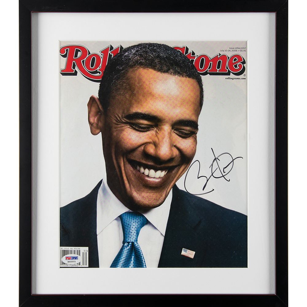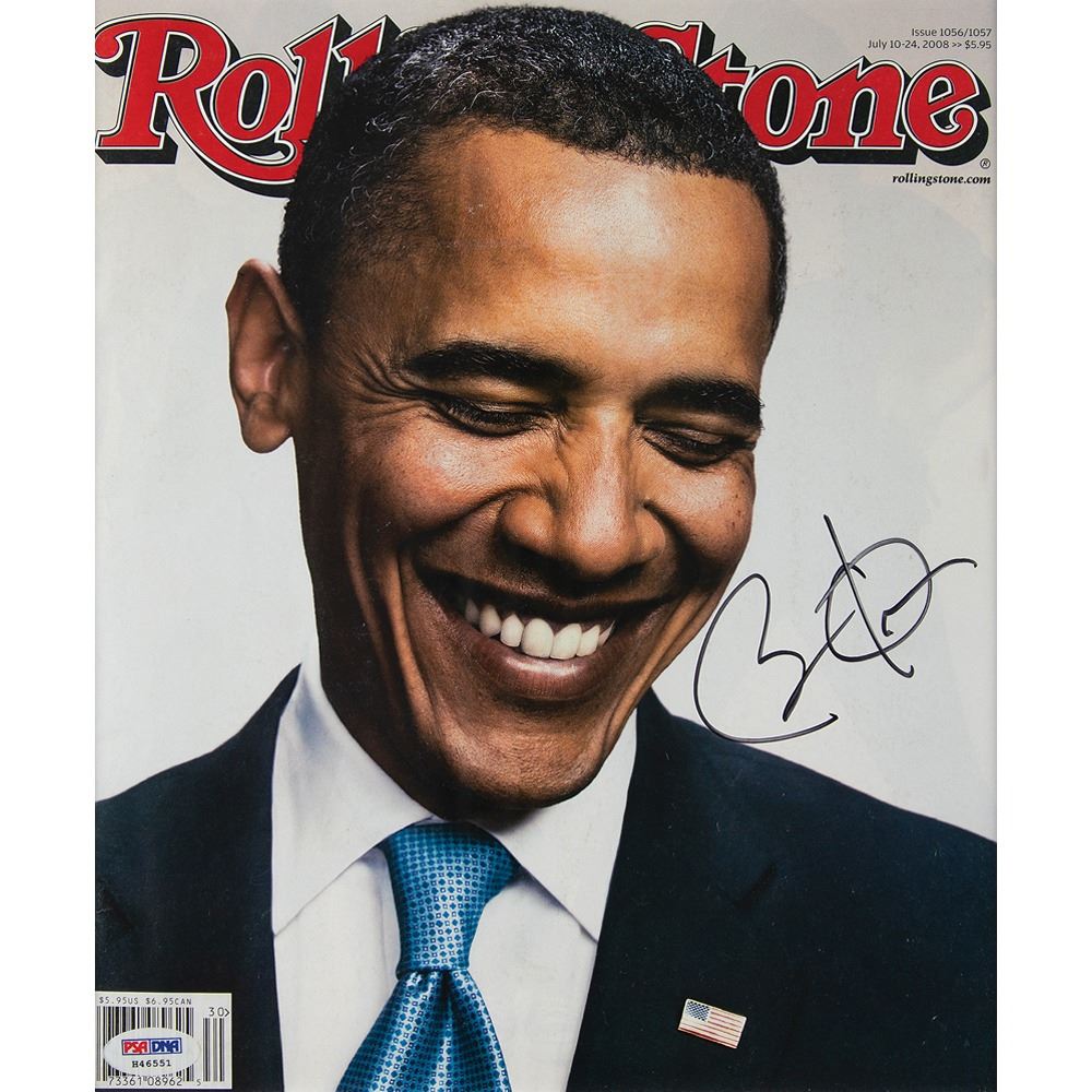 Desirable July 2008 issue of Rolling Stone magazine featuring Barack Obama on the cover, 9.25 x 11.25, signed in black felt tip. In fine condition, with light handling wear and with a PSA/DNA label affixed to the lower corner (certificate of authenticity not present).