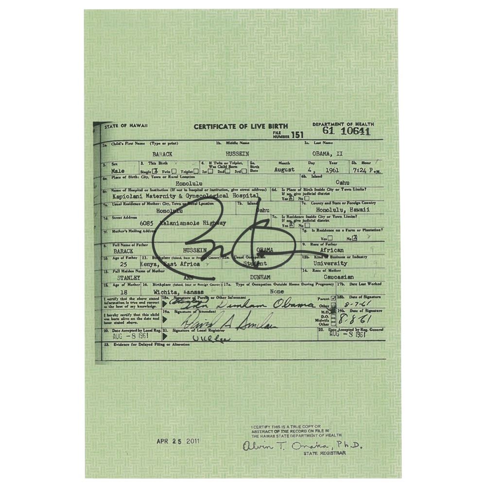Felt tip signature, "Barack Obama," on a 5.75 x 8.5 page, on which a copy of his 'Certificate of Live Birth' has been printed. In very fine condition. In 2011, President Obama released this 'long form' version of his Hawaii birth certificate in response to growing assertions that he was not a natural-born US citizen.