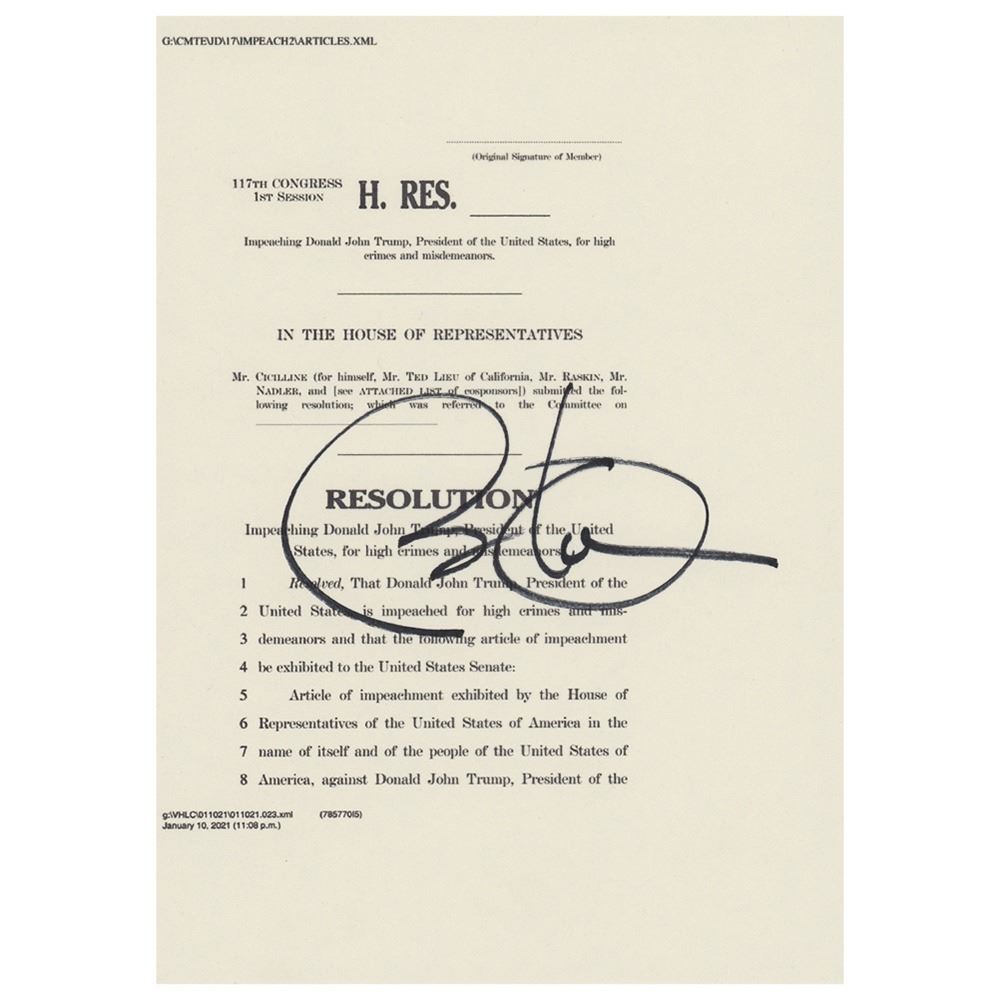 Felt tip signature, "Barack Obama," on a 5 x 7 page, on which the first page of the House Resolution impeaching President Donald Trump has been printed. In very fine condition.