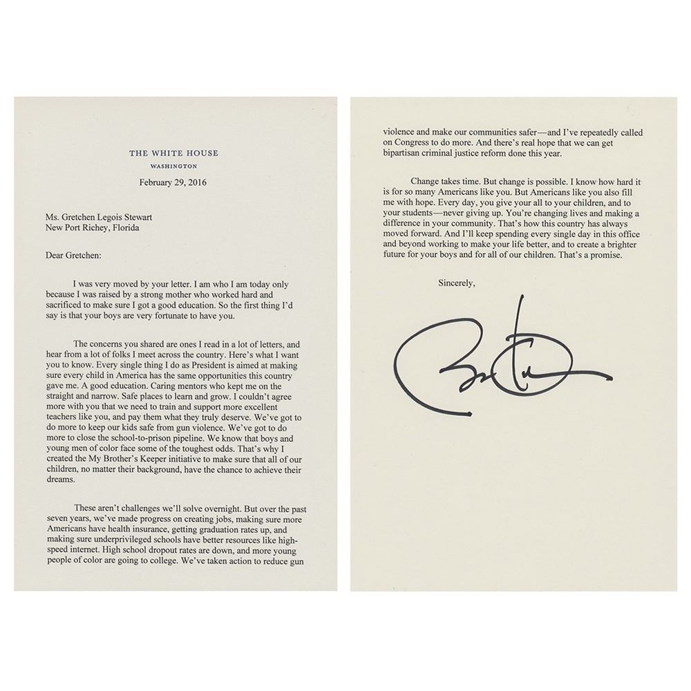 Felt tip signature, "Barack Obama," on a 6 x 9 page, on which a copy of the conclusion from his famous letter to a schoolteacher has been printed; the beginning of the letter is included on a same-size sheet of mock White House stationery. The text, in part: "I am who I am today only because I was raised by a strong mother who worked hard and sacrificed to make sure I got a good education. So the first thing I'd say is that your boys are very fortunate to have you…Every single thing I do as President is aimed at making sure every child in America has the same opportunities this country gave me. A good education. Caring mentors who kept me on the straight and narrow. Safe places to learn and grow. I couldn't agree more with you that we need to train and support more excellent teachers like you, and pay them what they truly deserve. We've got to do more to keep our kids safe from gun violence. We've got to do more to close the school-to-prison pipeline. We know that boys and young men of color face some of the toughest odds. That's why I created the My Brother's Keeper initiative to make sure that all of our children, no matter their background, have the chance to achieve their dreams." In fine condition, with trimmed edges.