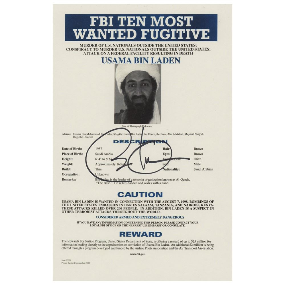 Felt tip signature, "Barack Obama," on a 6 x 9 page, on which a copy of Osama bin Laden's wanted poster has been printed. In very fine condition. President Obama authorized the raid by SEAL Team Six on bin Laden's compound in Abbottabad, Pakistan, in 2011.