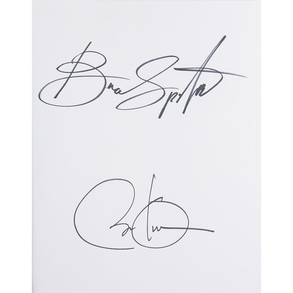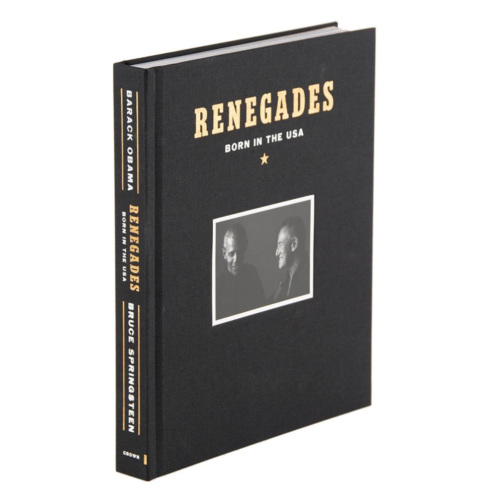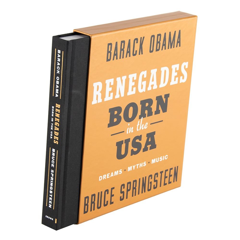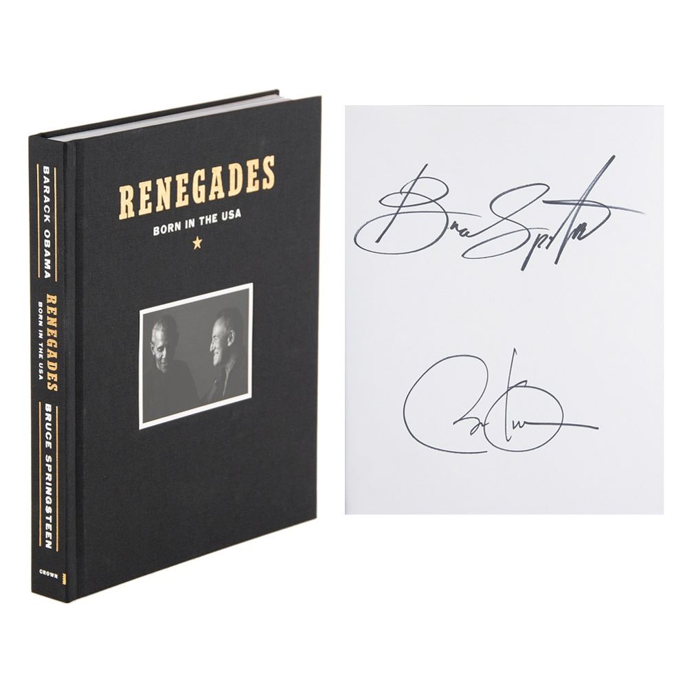 Signed book: Renegades: Born in the USA. Deluxe first edition. NY: Crown Publishing, 2021. Hardcover with slipcase, 9.5 x 11.5, 303 pages. Signed prominently on an opening page in black felt tip by Barack Obama and Bruce Springsteen. In very fine condition. A sought-after and beautifully produced expansion of their groundbreaking Higher Ground podcast, featuring more than 350 photographs, exclusive bonus content, and never-before-seen archival material.