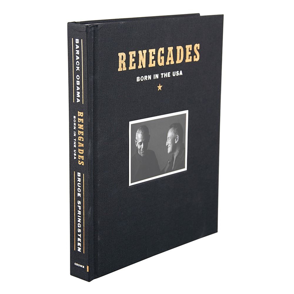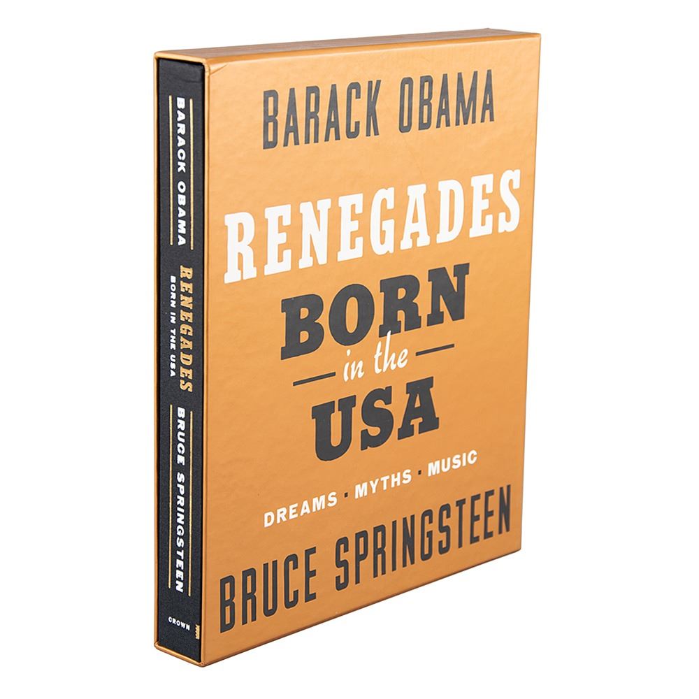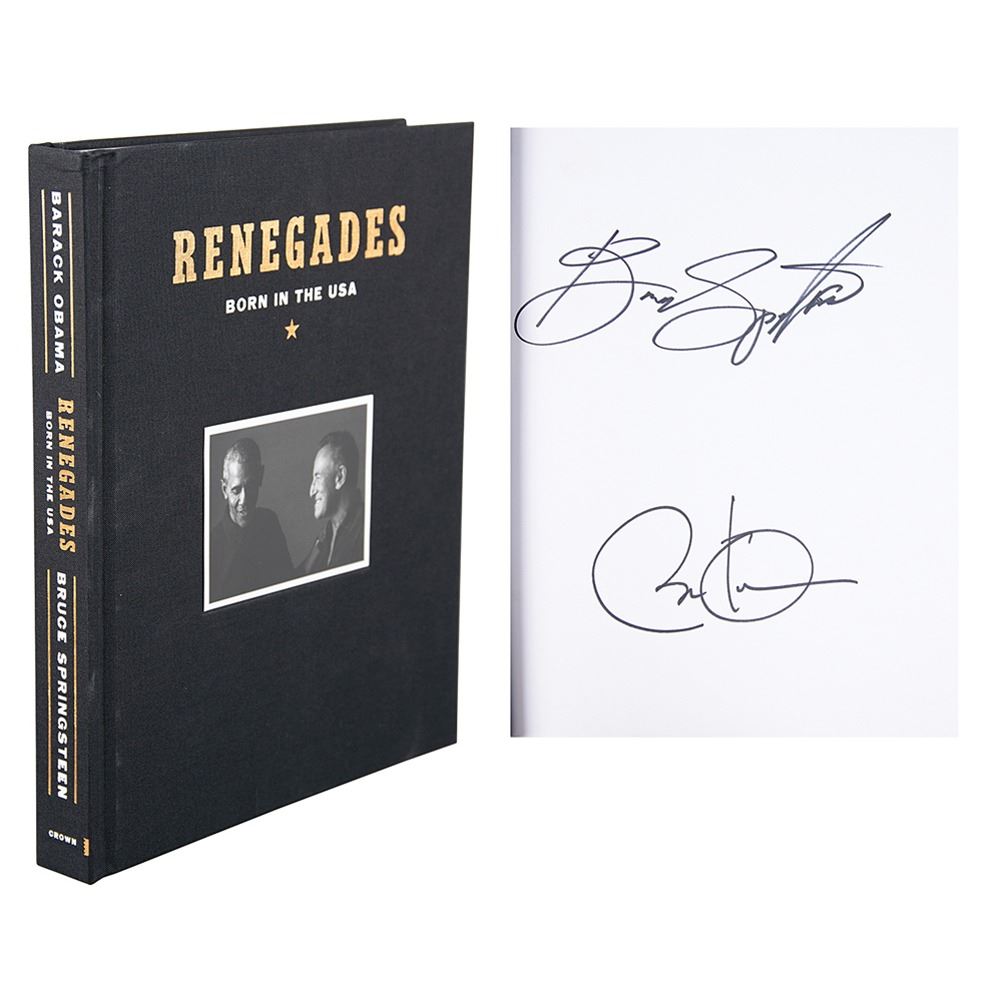 Signed book: Renegades: Born in the USA. Deluxe first edition. NY: Crown Publishing, 2021. Hardcover with slipcase, 9.5 x 11.5, 303 pages. Signed prominently on an opening page in black felt tip by Barack Obama and Bruce Springsteen. In fine condition. Accompanied by the original cardboard shipping box. A sought-after and beautifully produced expansion of their groundbreaking Higher Ground podcast, featuring more than 350 photographs, exclusive bonus content, and never-before-seen archival material.