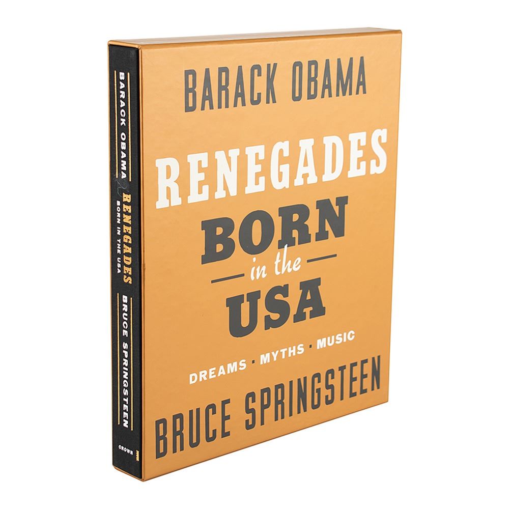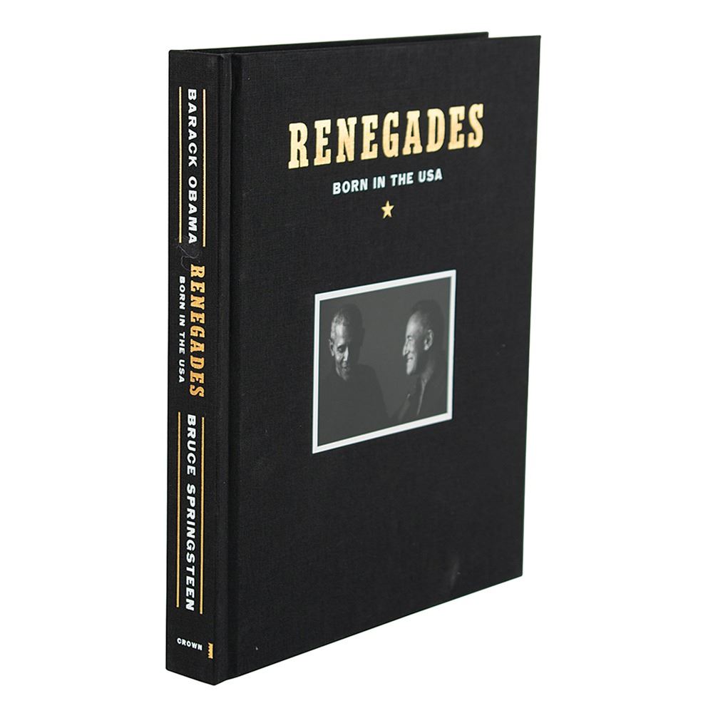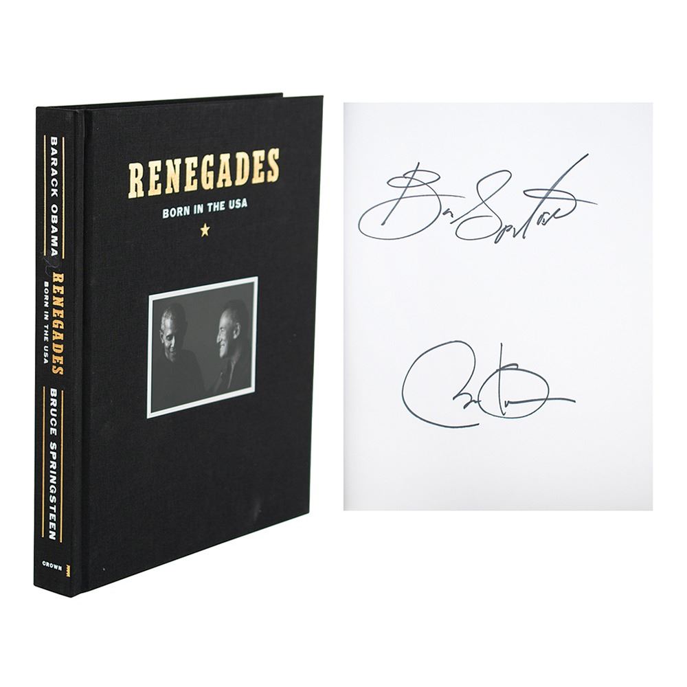 Signed book: Renegades: Born in the USA. Deluxe first edition. NY: Crown Publishing, 2021. Hardcover with slipcase, 9.5 x 11.5, 303 pages. Signed prominently on an opening page in black felt tip by Barack Obama and Bruce Springsteen. In very fine condition. Accompanied by the original cardboard shipping box. A sought-after and beautifully produced expansion of their groundbreaking Higher Ground podcast, featuring more than 350 photographs, exclusive bonus content, and never-before-seen archival material.