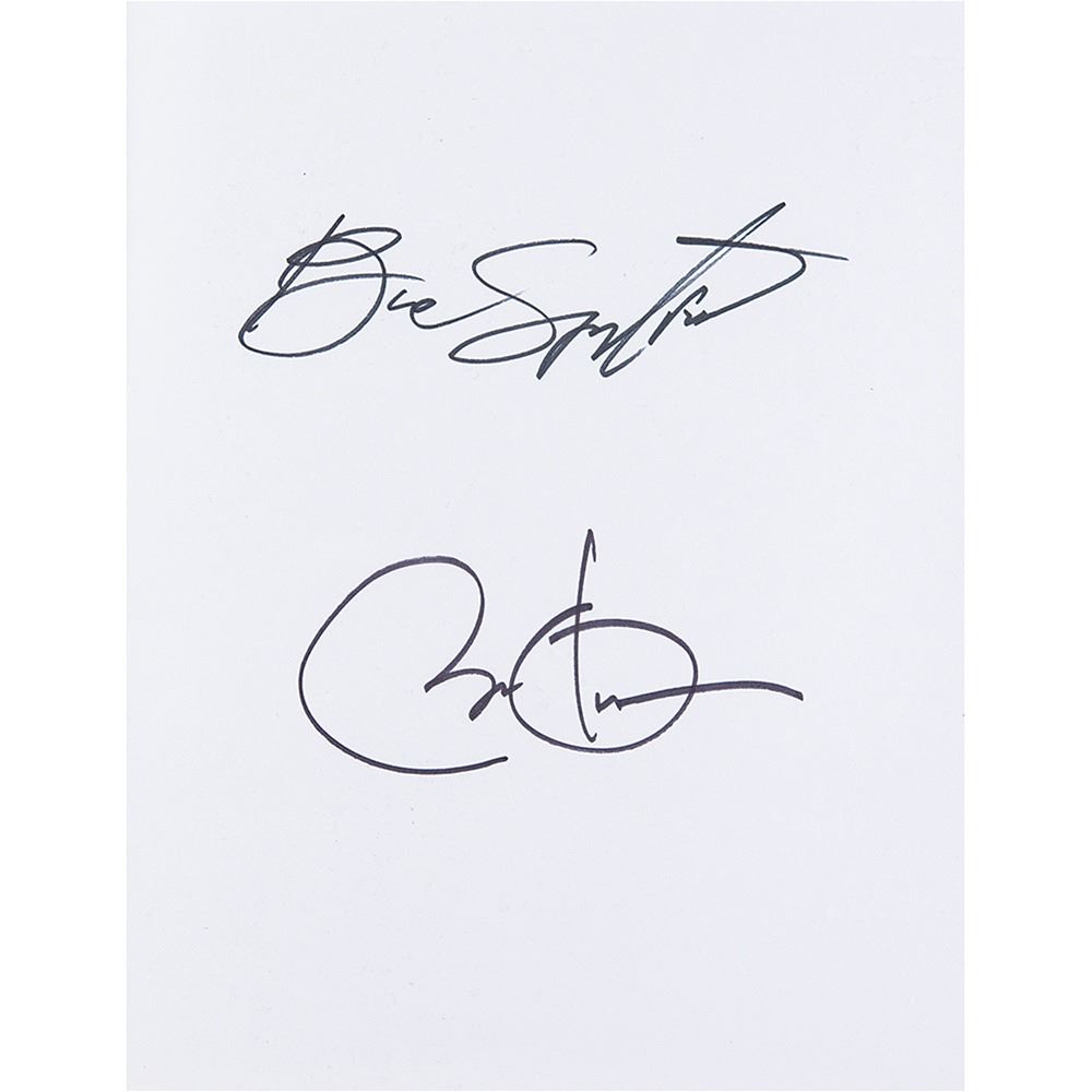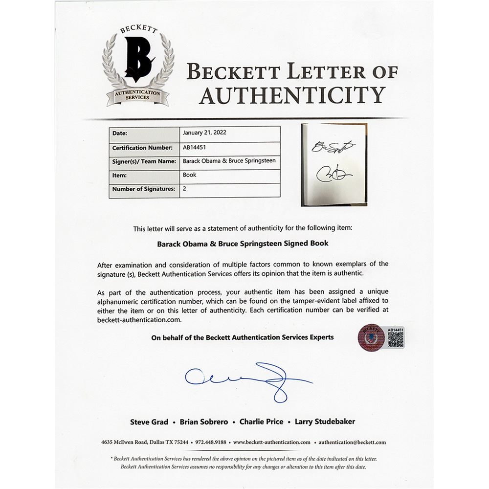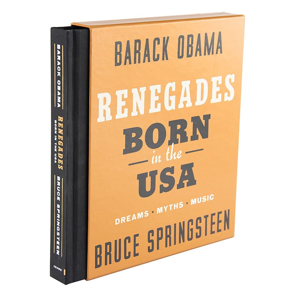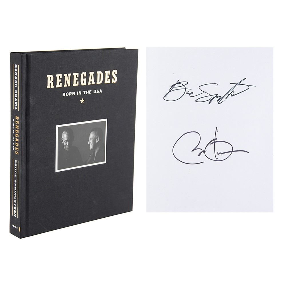 Signed book: Renegades: Born in the USA. Deluxe first edition. NY: Crown Publishing, 2021. Hardcover with slipcase, 9.5 x 11.5, 303 pages. Signed prominently on an opening page in black felt tip by Barack Obama and Bruce Springsteen. In very fine condition. A sought-after and beautifully produced expansion of their groundbreaking Higher Ground podcast, featuring more than 350 photographs, exclusive bonus content, and never-before-seen archival material. Accompanied by a full letter of authenticity from Beckett Authentication Services.