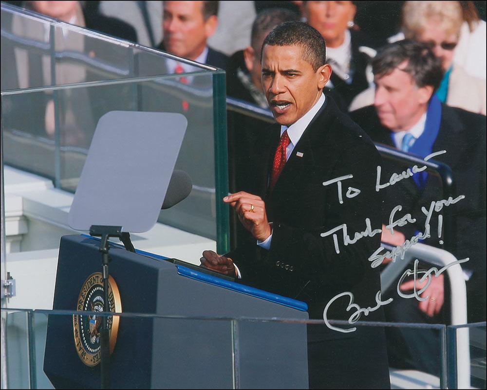Color glossy 10 x 8 photo, signed and inscribed in silver ink as president, “To Laura – Thanks for your support! Barack Obama.” In fine condition. Signature was originally acquired at a Caterpillar plant in Peoria, Illinois, in February 2009, and is accompanied by a letter of provenance detailing the story, two candid snapshots of the presidential motorcade en route to the plant, and a candid laser print photo of Obama delivering his speech.