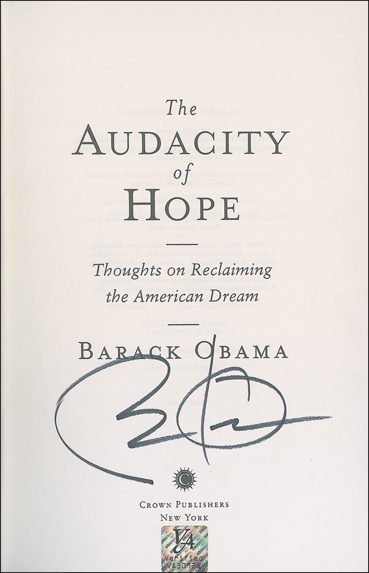 Signed book: The Audacity of Hope. First edition. NY: Crown Publishers, 2006. Hardcover with dustjacket, 6.5 x 9.5, 375 pages. Signed on the title page in black felt tip. In fine condition.