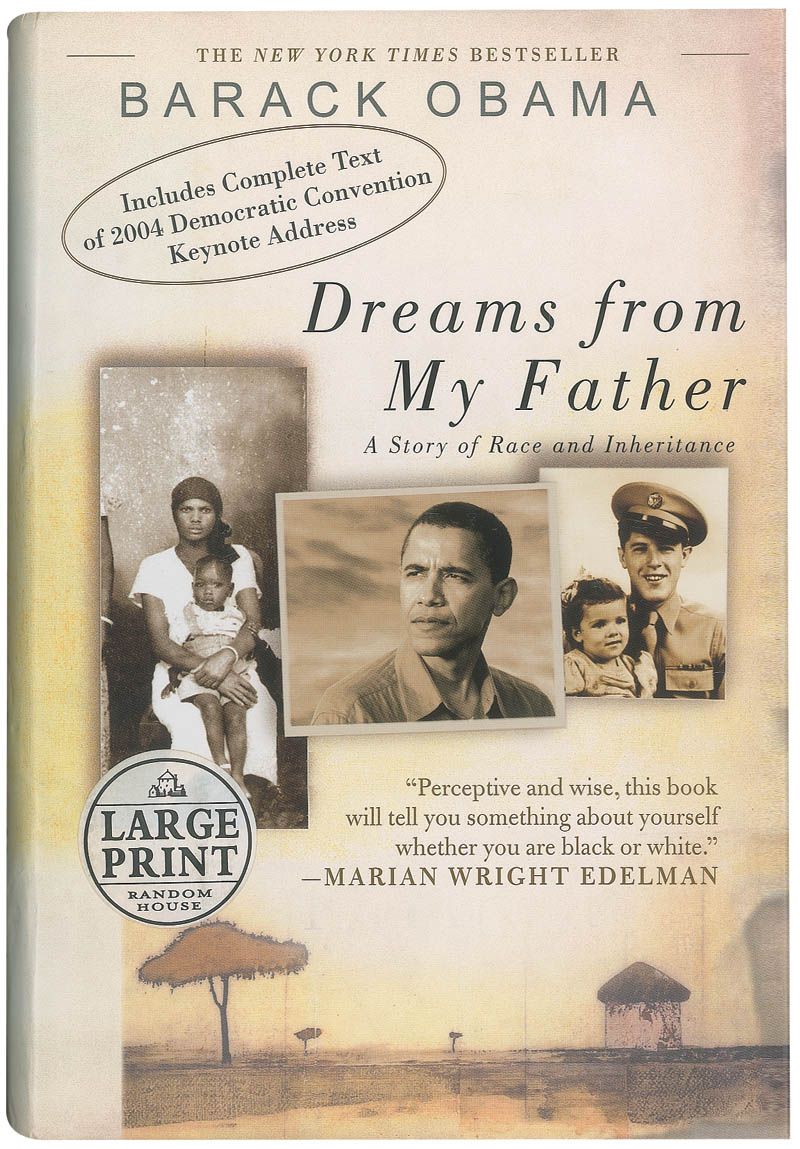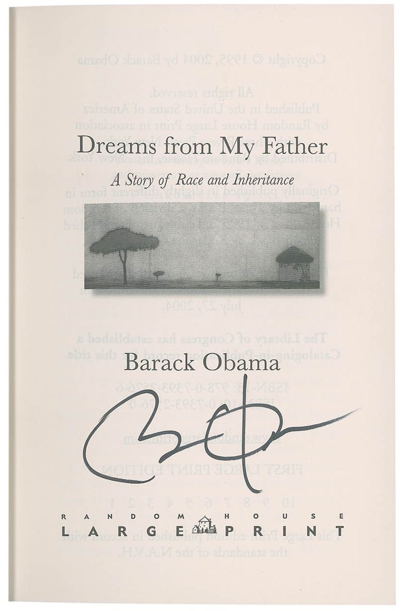 Signed book: Dreams from My Father. First large print edition, first printing. NY: Random House, 2004. Hardcover with dustjacket, 6.5 x 9.5, 691 pages. Signed on the title page in black felt tip. Book description: VG+/VG+. Cream and brick paper-covered boards; minor rubbing to edges; minimal soiling to textblock edges. Dust jacket has minor creasing to corners/spine-ends; light indentations along spine; and light soiling, including one small ink mark to lower spine.