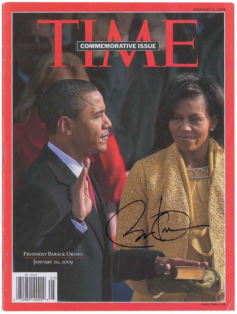 Commemorative issue of Time magazine, dated January 20, 2009, with an image of Obama taking the oath of office, signed on the front cover, as president, in black felt tip. In fine condition, with some light handling wear and wrinkling. Accompanied by a letter of authenticity from James Spence.