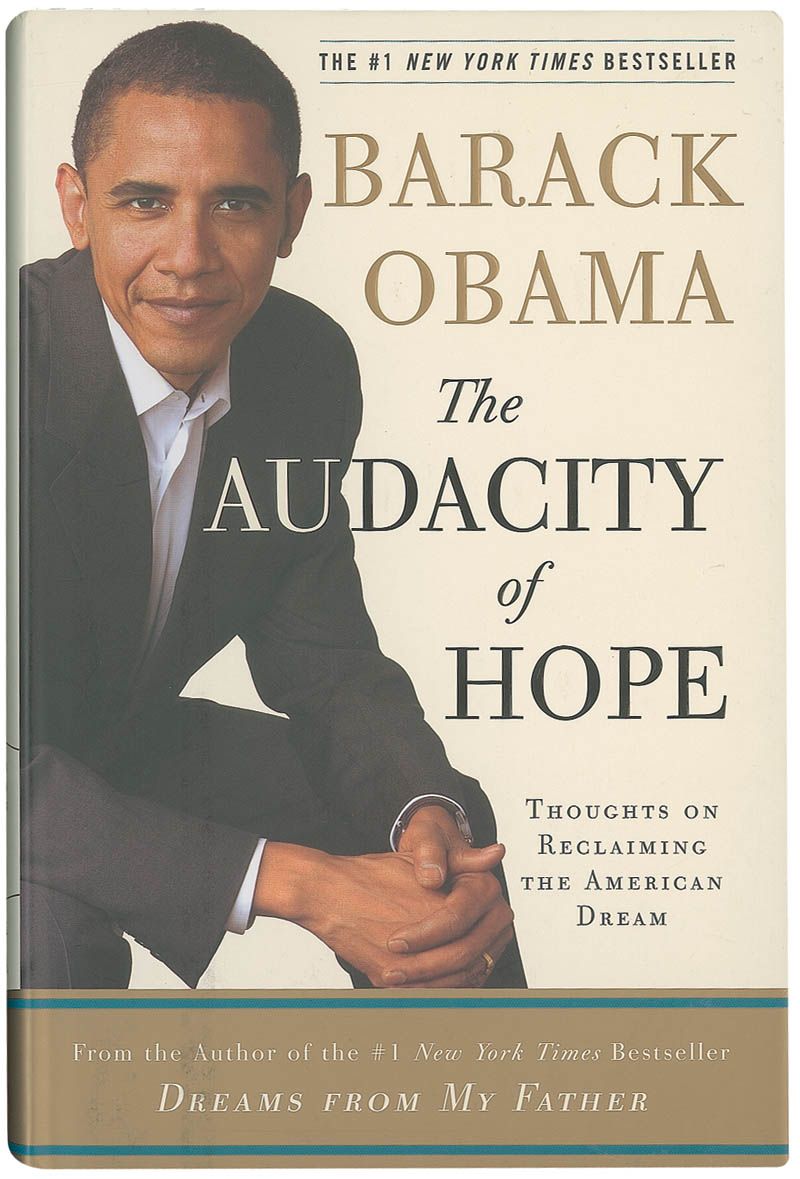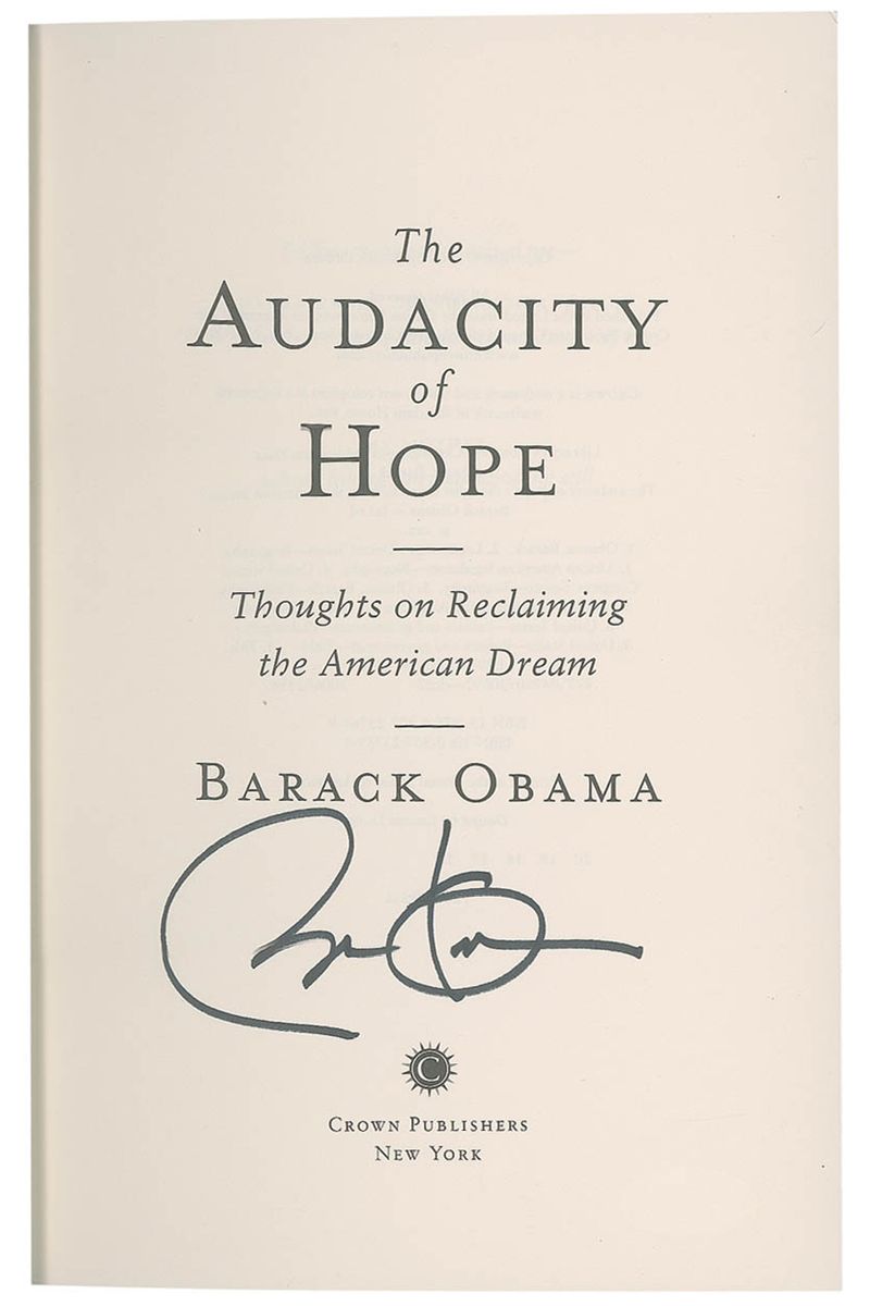 Signed book: The Audacity of Hope. First edition, later printing. NY: Crown Publishers, 2006. Hardcover with dustjacket, 6.5 x 9.5, 375 pages. Signed on the title page in black felt tip. In fine condition, with a James Spence authentication label affixed to lower corner of the reverse of title page. Accompanied by a letter of authenticity from James Spence.