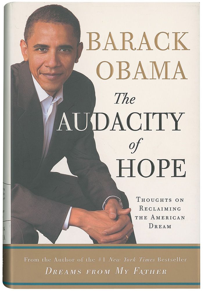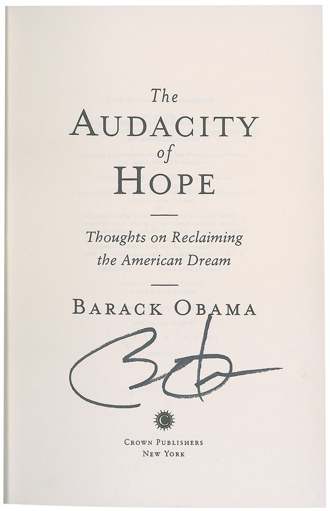 Signed book: The Audacity of Hope. First edition, later printing. NY: Crown Publishers, 2006. Hardcover with dustjacket, 6.5 x 9.5, 375 pages. Signed on the title page in black felt tip. Autographic condition: fine. Book condition: NF/VG+. Black paper-covered boards; two miniscule spots of soiling on upper textblock edge, otherwise like new. Dust jacket has minor creases at corners and is slightly rubbed.