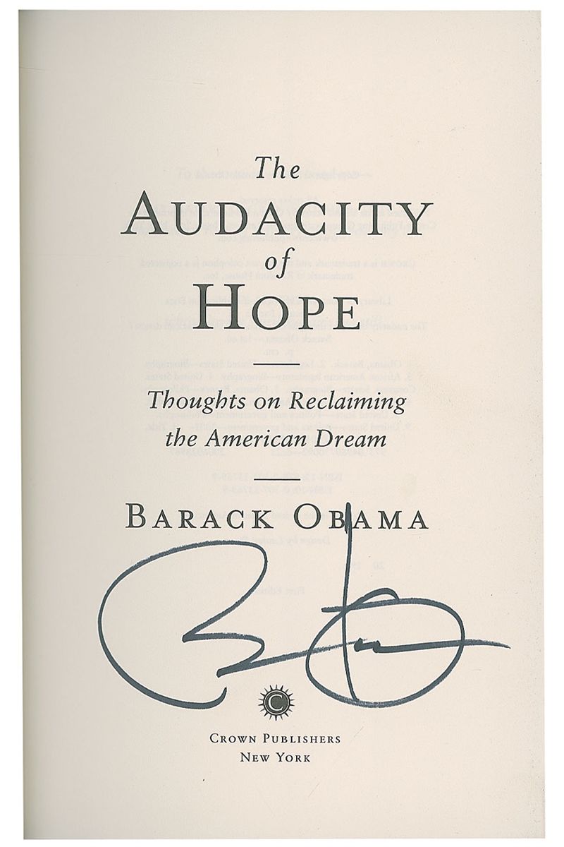 Signed book: The Audacity of Hope. First edition, later printing. NY: Crown Publishers, 2006. Hardcover with dust jacket, 6.5 x 9.5, 375 pages. Signed on the title page in black felt tip. Autographic condition: fine. Book condition: F/VG+. Black paper-covered boards, with no discernible flaws. Dust jacket has light wear to edges and easily removable price-sticker to rear cover.