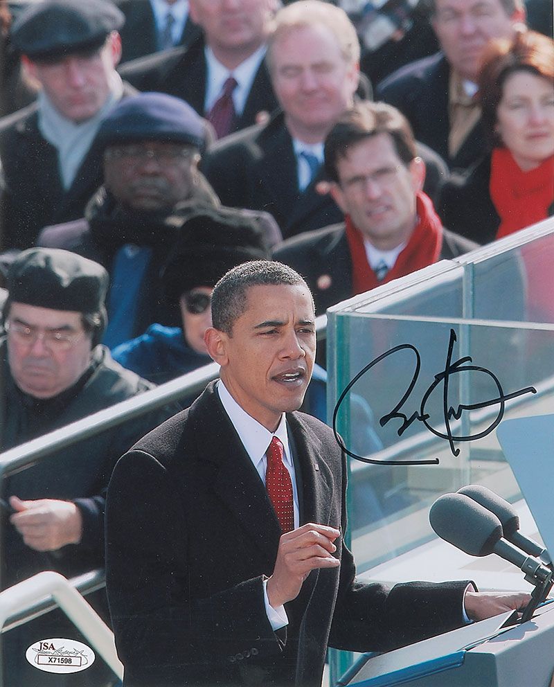 Color glossy 8 x 10 photo of Obama giving his inaugural address, signed in black felt tip. In fine condition, with a James Spence authentication label affixed to lower corner. Accompanied by a letter of authenticity from James Spence.